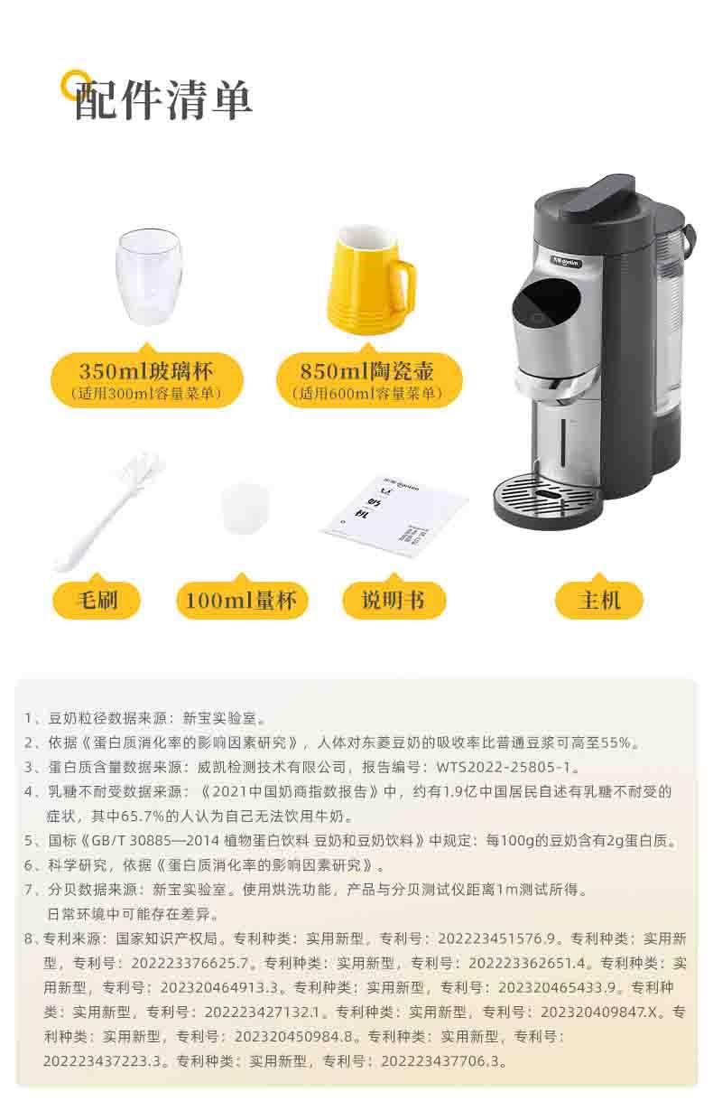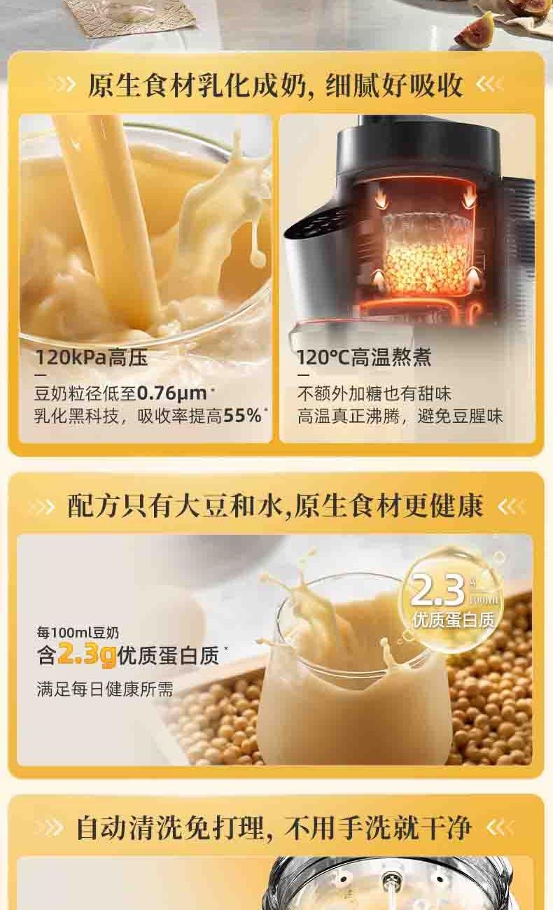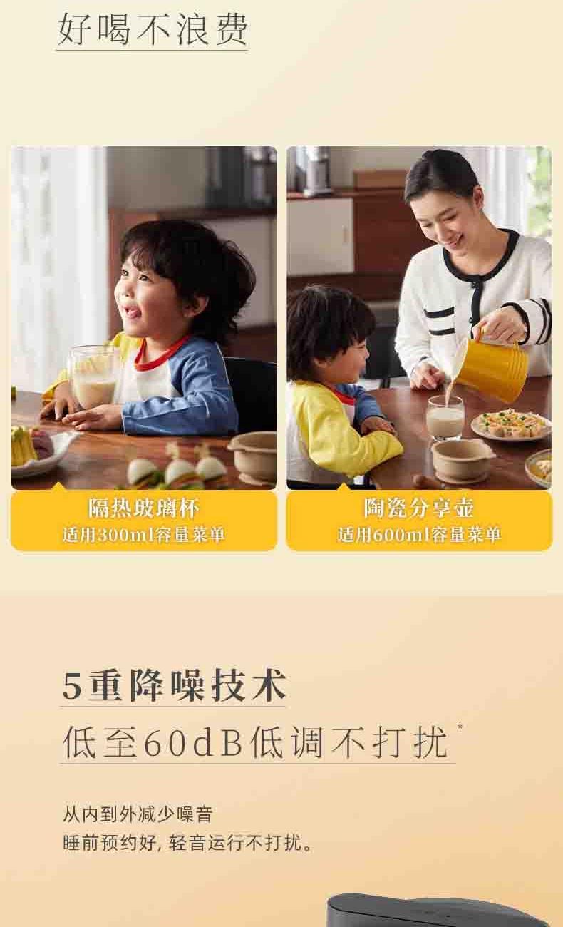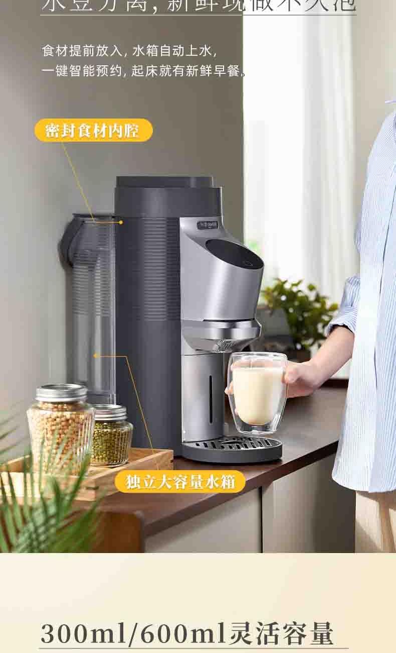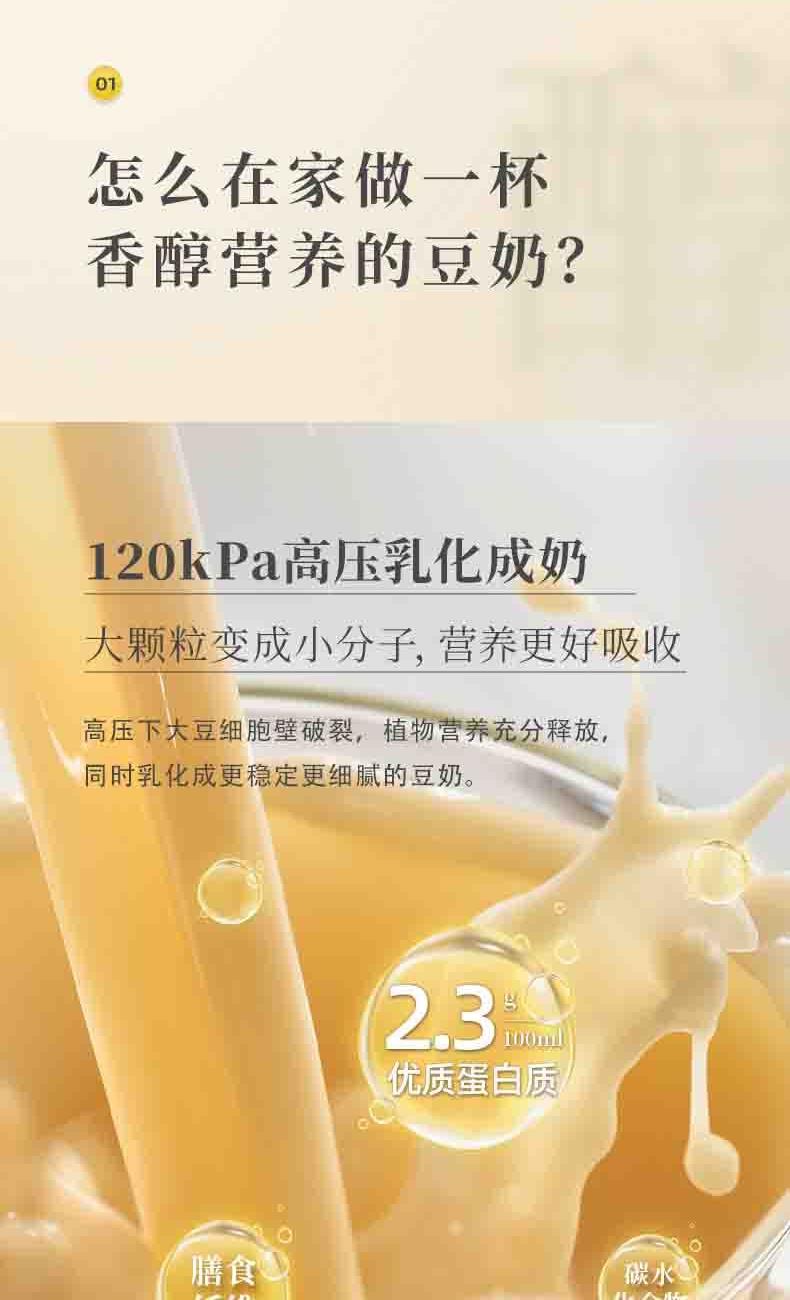容量:300ml/600ml可选 功率:1400W 毛重:9.82kg 产品尺寸:181*402*430mm 包装尺寸:574*270*557mm 配置:600ml陶瓷杯+300ml玻璃杯1.120kPa高压乳化成奶,大豆粒径低至0.76μm,好吸收 2.120℃高温熬煮,避免豆腥味,释放豆子天然甜味 3.24小时预约水豆分离,热水自动烘洗 4.醇豆奶 坚果奶 五谷浆 果蔬汁 快浆 洪洗