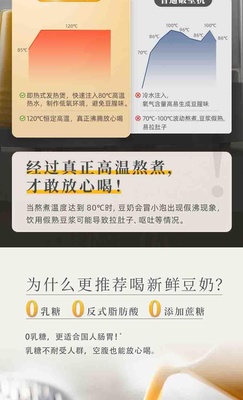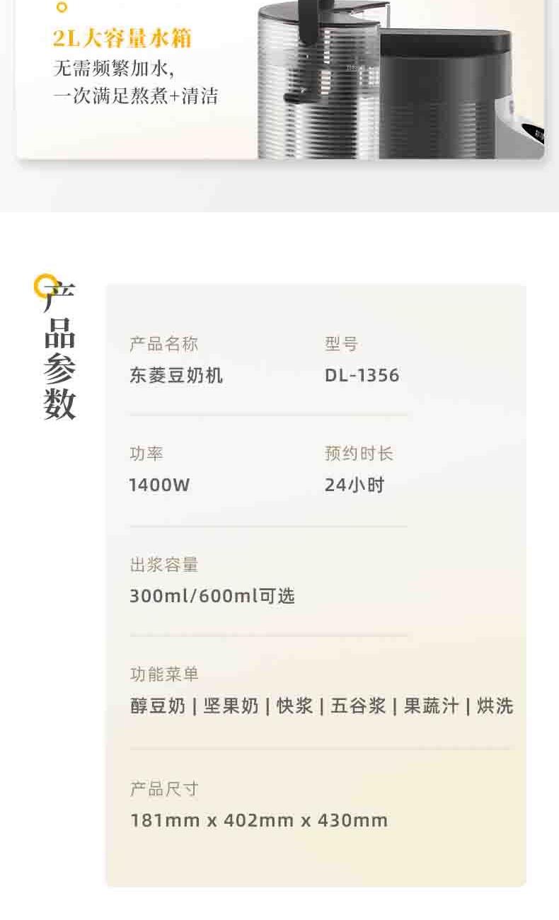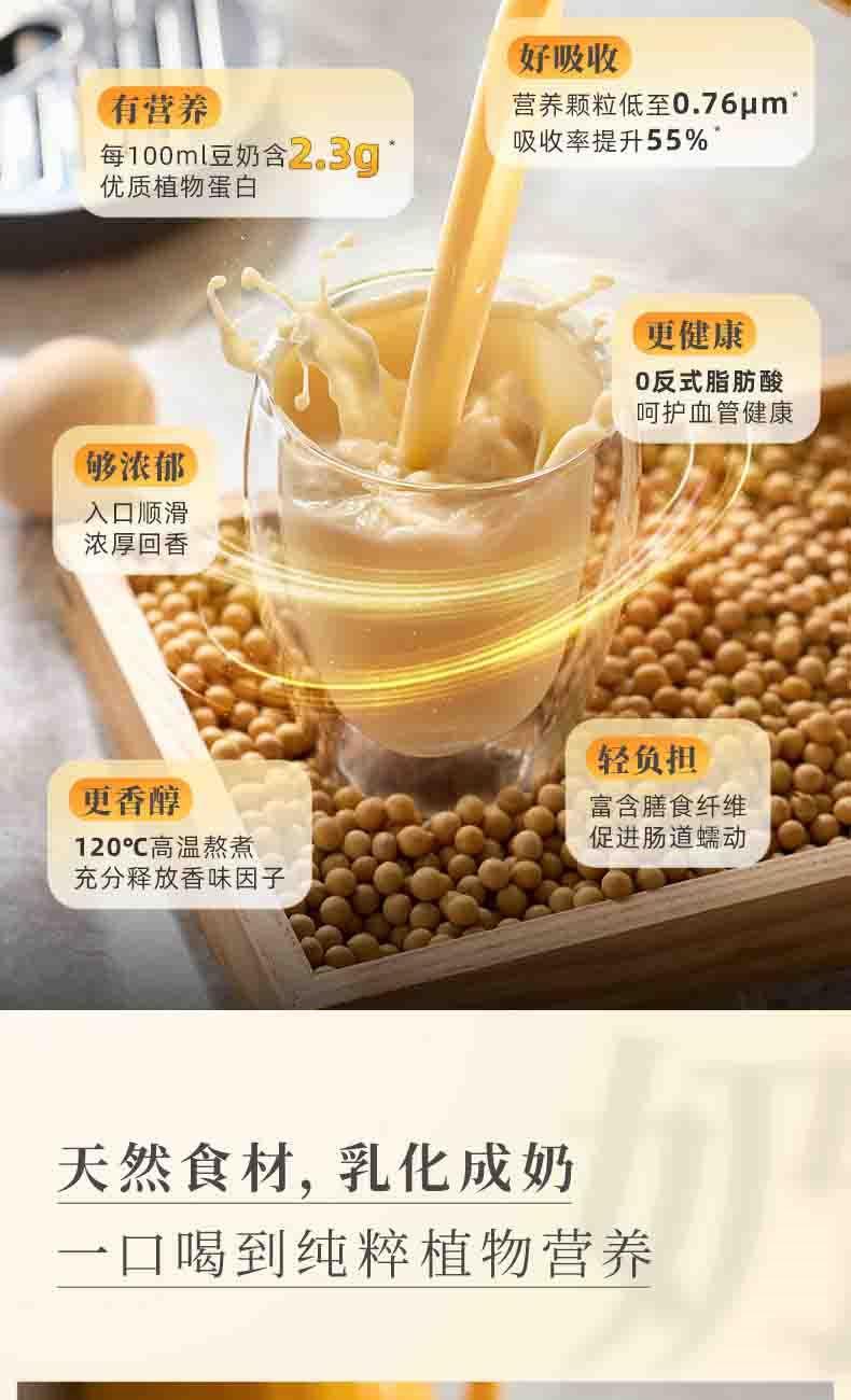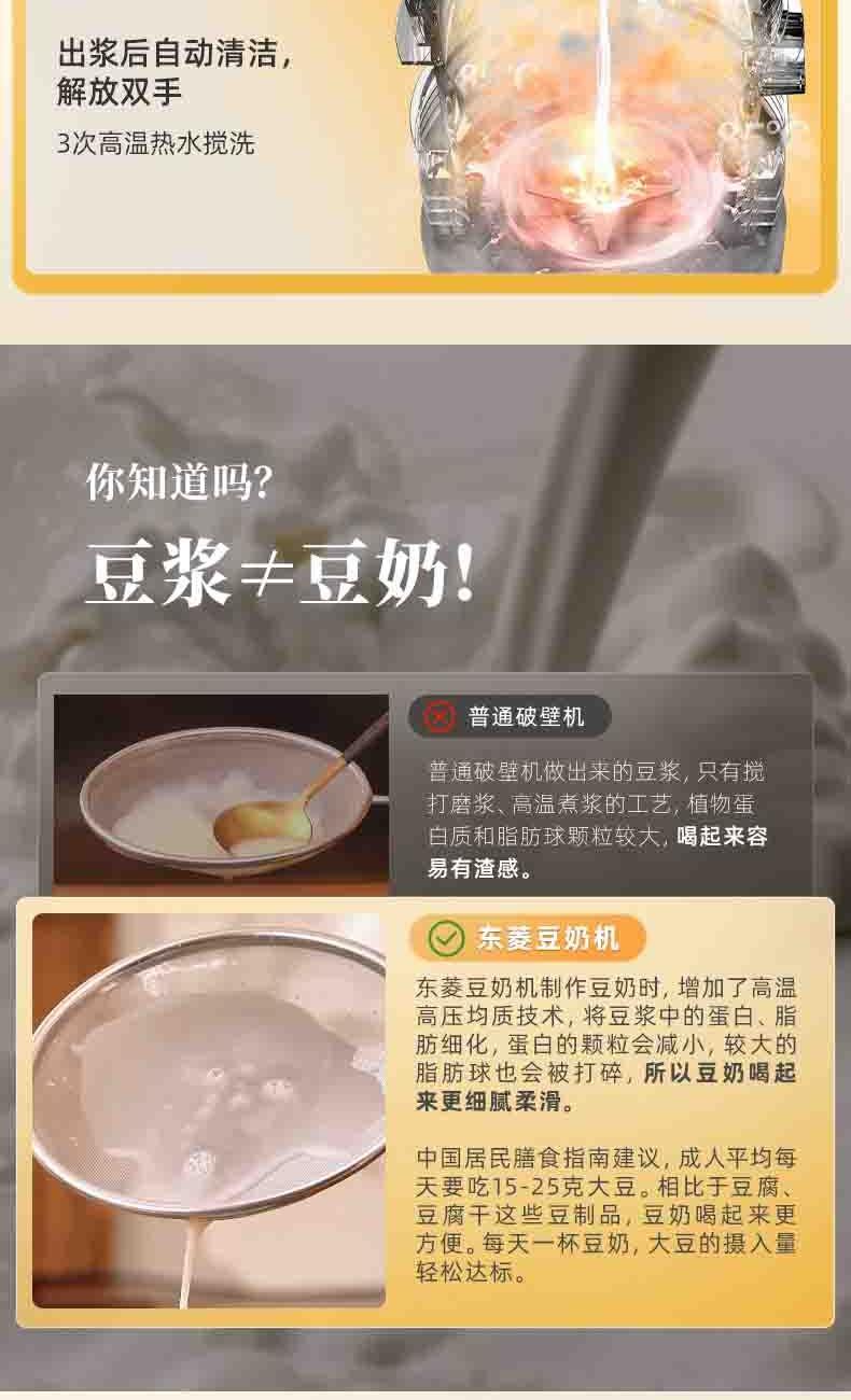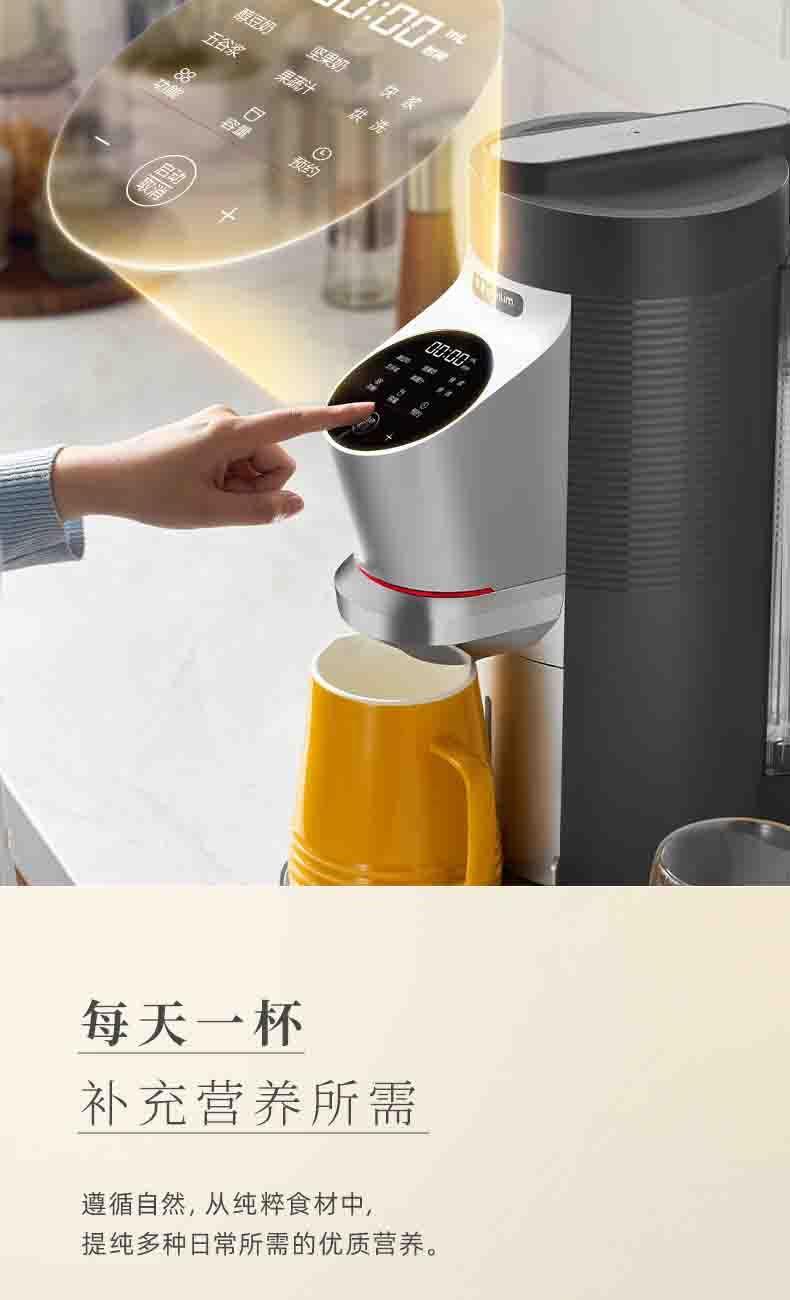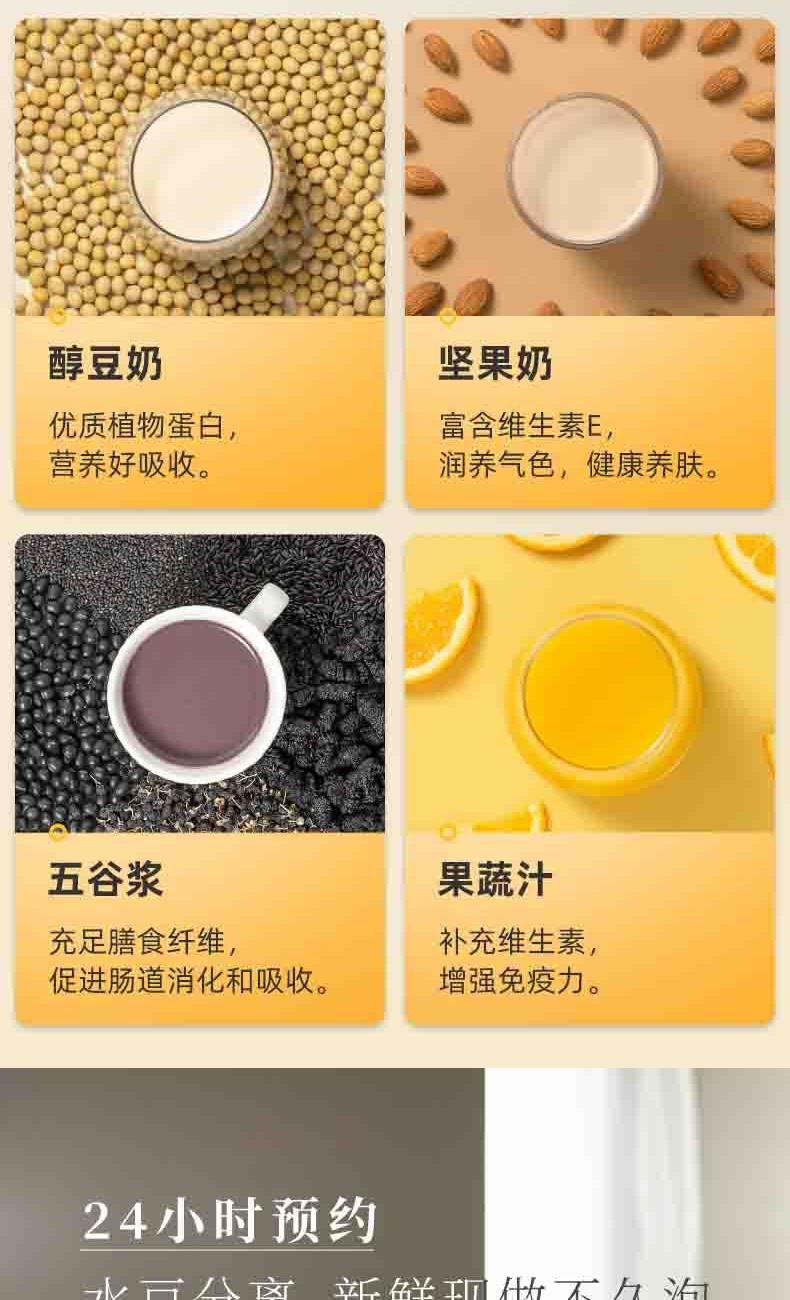容量:300ml/600ml可选 功率:1400W 毛重:9.82kg 产品尺寸:181*402*430mm 包装尺寸:574*270*557mm 配置:600ml陶瓷杯+300ml玻璃杯1.120kPa高压乳化成奶,大豆粒径低至0.76μm,好吸收 2.120℃高温熬煮,避免豆腥味,释放豆子天然甜味 3.24小时预约水豆分离,热水自动烘洗 4.醇豆奶 坚果奶 五谷浆 果蔬汁 快浆 洪洗
