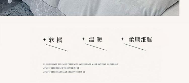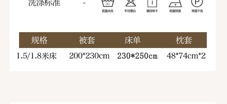 被套:200*230cm 床单:230*250cm 枕套:48*74cm*2 面料:牛奶绒 产品包装:精美礼盒 包装尺寸:50*40*20cm 特点:牛奶绒面料,充分吸收汗气蒸发产生的热量,舒适透气,精美大方,绒感细腻,呵护您娇嫩肌肤新型植绒技术,绒毛结构丰盈紧实,不易掉毛告别掉毛烦恼。