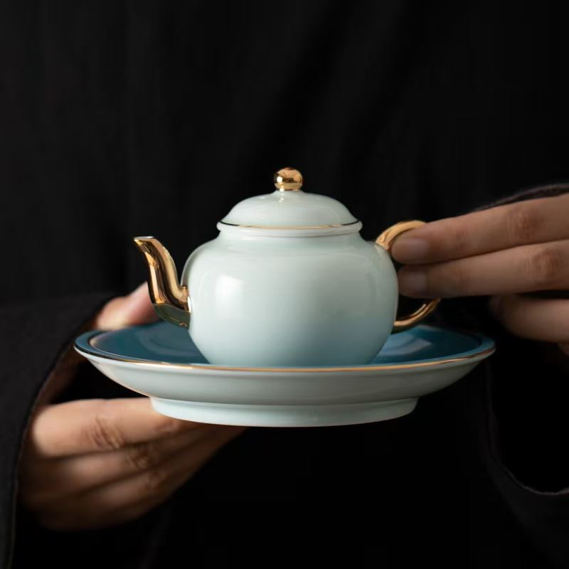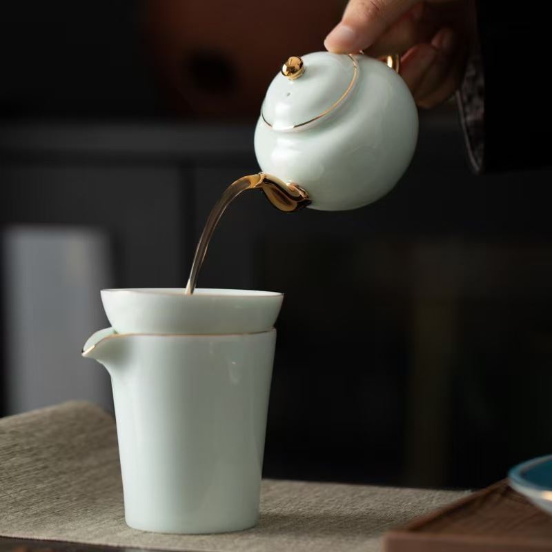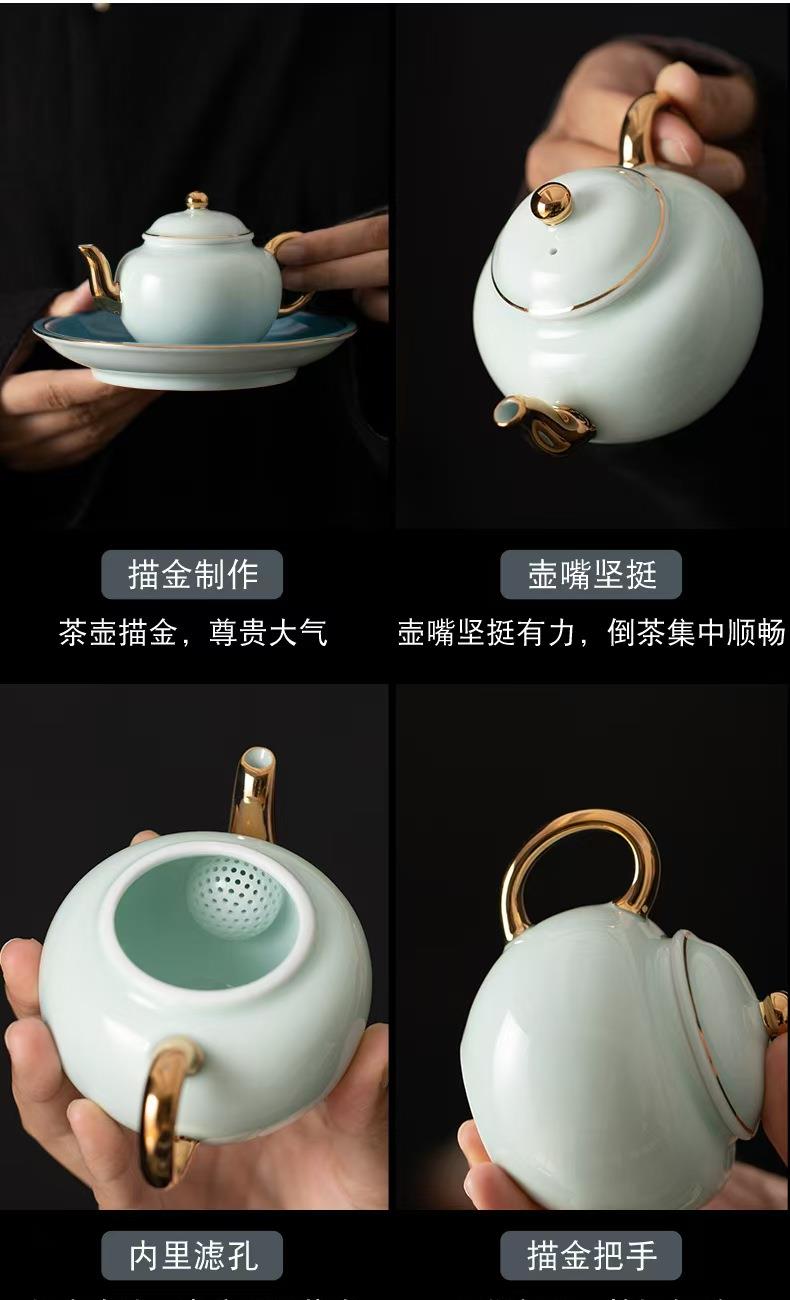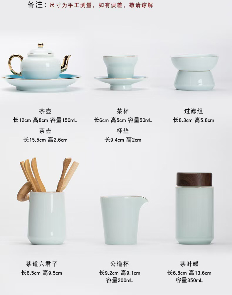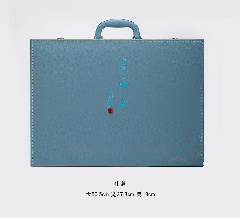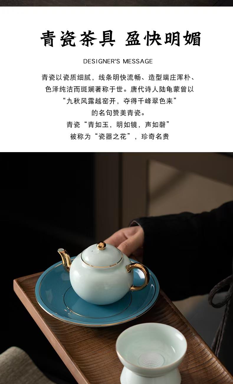 配制:1壶 6杯 1壶承 6碟 1锦盒 规格:壶:12*8cm 公道杯:9.2*9.1cm 茶杯:6cm*5cm 手提锦盒:39*27*13cm 材质:青山玉 24K真金 推荐说明:青山玉是青瓷新品,以瓷质细腻,线条明快流畅,色泽纯洁而斑斓著称。青如玉,明如镜,声如磬,描24K真金奢华装饰,被称为瓷器之花。
