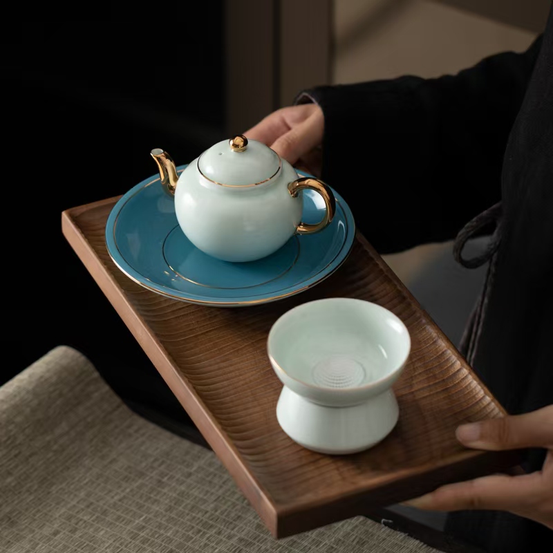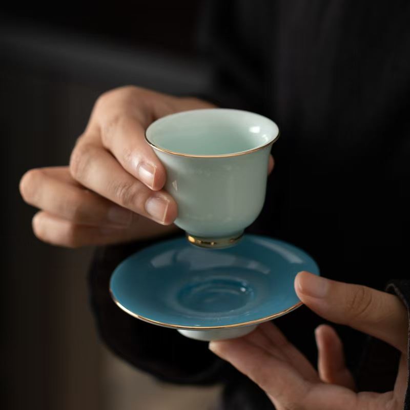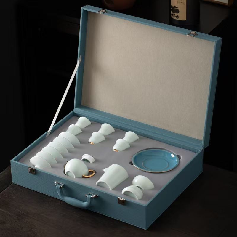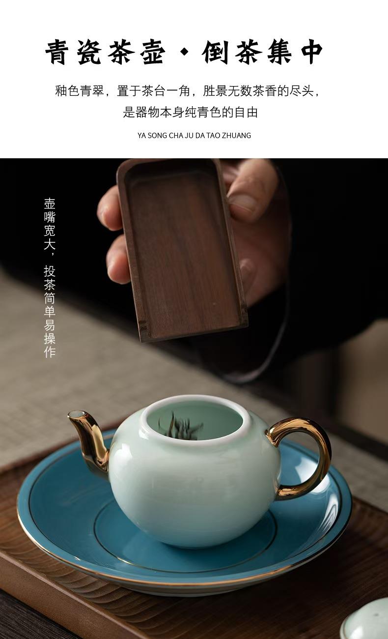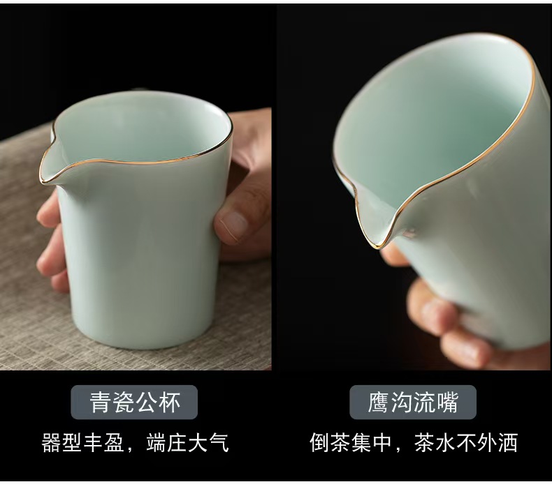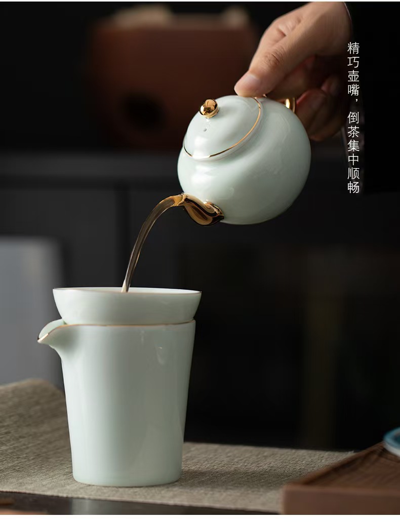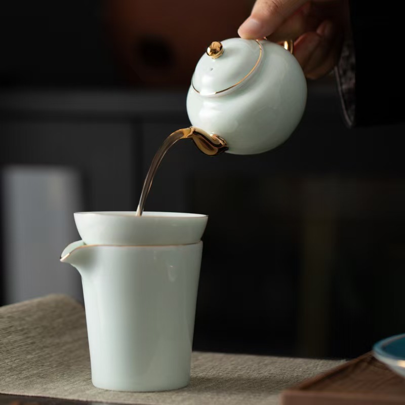 配制:1壶 6杯 1壶承 6碟 1锦盒 规格:壶:12*8cm 公道杯:9.2*9.1cm 茶杯:6cm*5cm 手提锦盒:39*27*13cm 材质:青山玉 24K真金 推荐说明:青山玉是青瓷新品,以瓷质细腻,线条明快流畅,色泽纯洁而斑斓著称。青如玉,明如镜,声如磬,描24K真金奢华装饰,被称为瓷器之花。