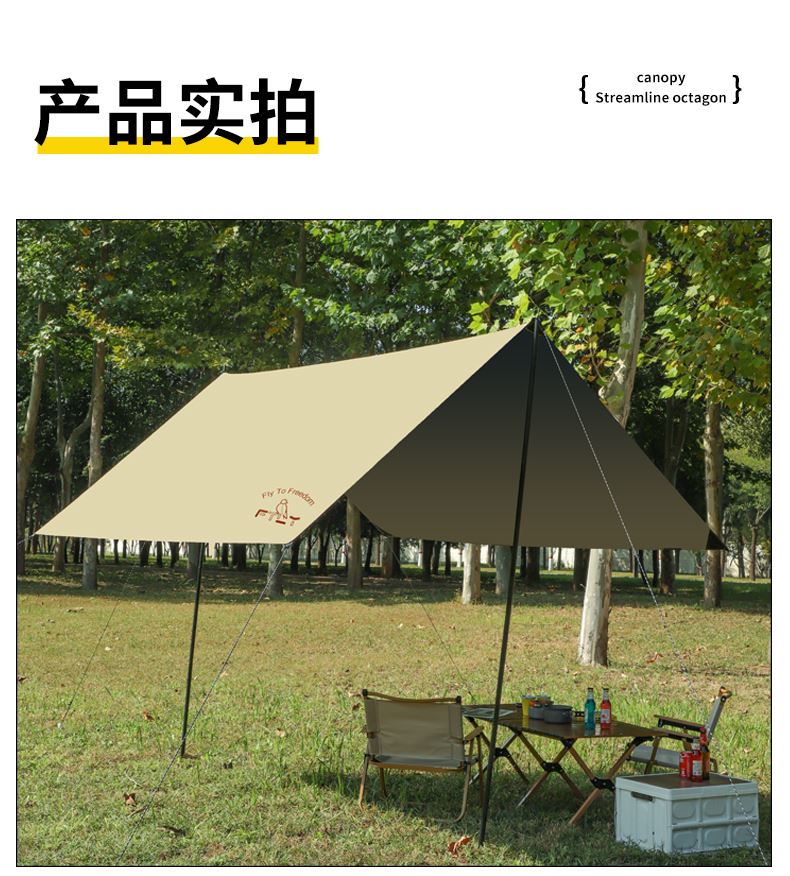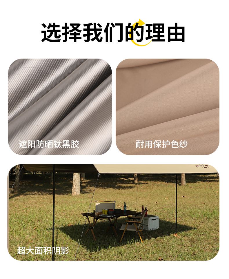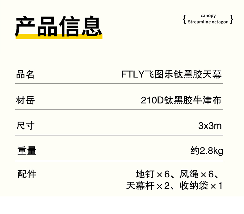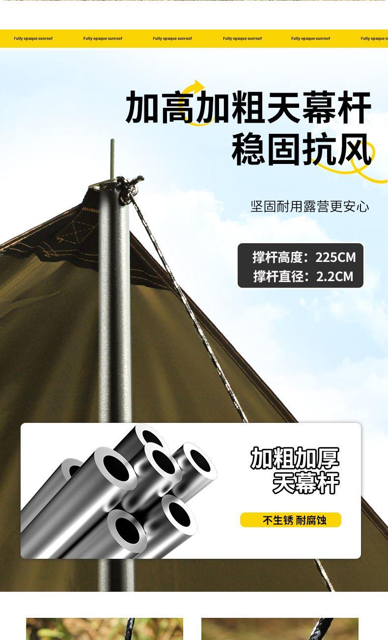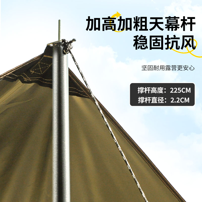 铁管直径:2.2cm 高度:225cm 防晒系数:UPF50+ 防水系数:pu3000+ 材质:210D钛黑胶牛津布 颜色:流沙金 尺寸:3*3m 重量:约2.8kg