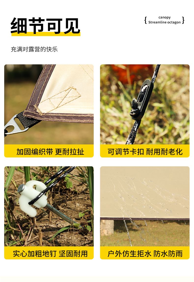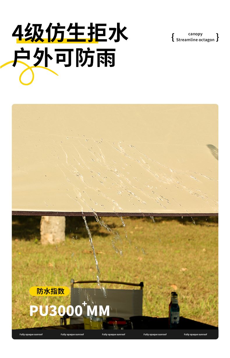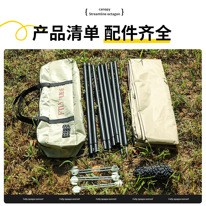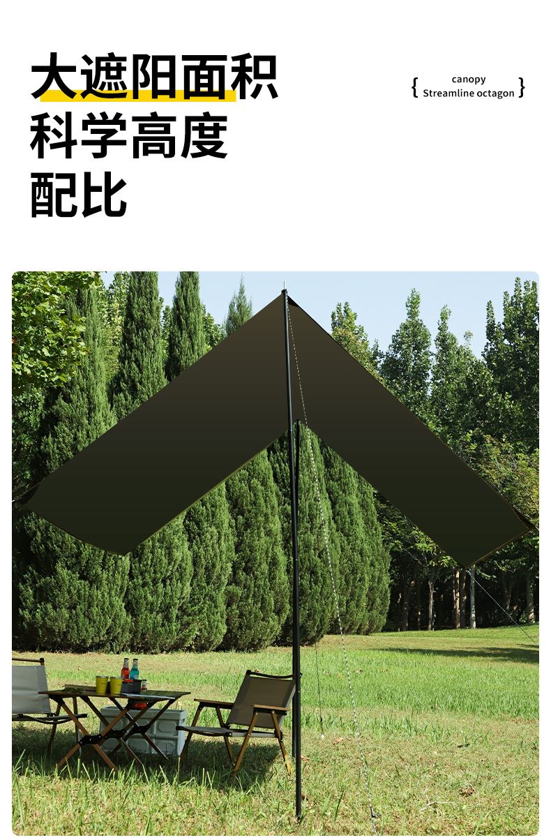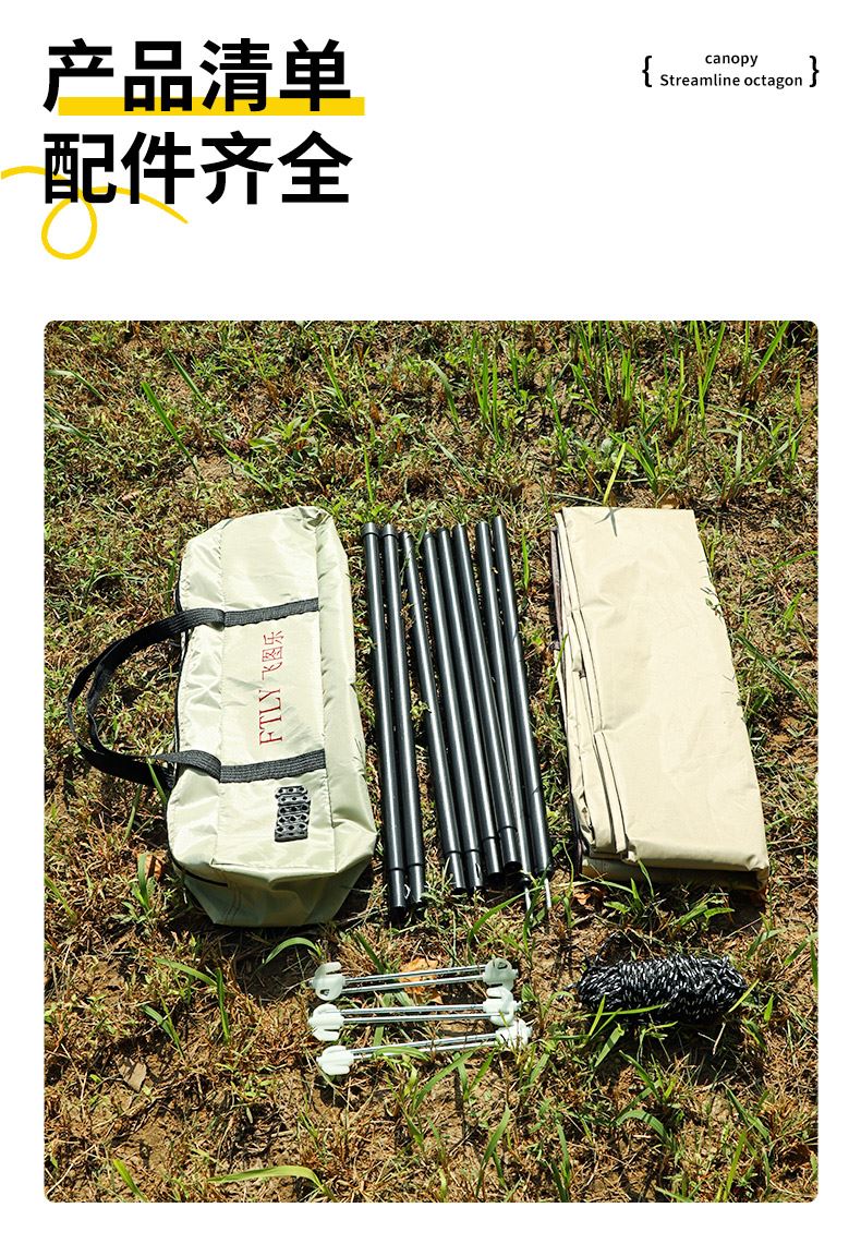 铁管直径:2.2cm 高度:225cm 防晒系数:UPF50+ 防水系数:pu3000+ 材质:210D钛黑胶牛津布 颜色:流沙金 尺寸:3*3m 重量:约2.8kg