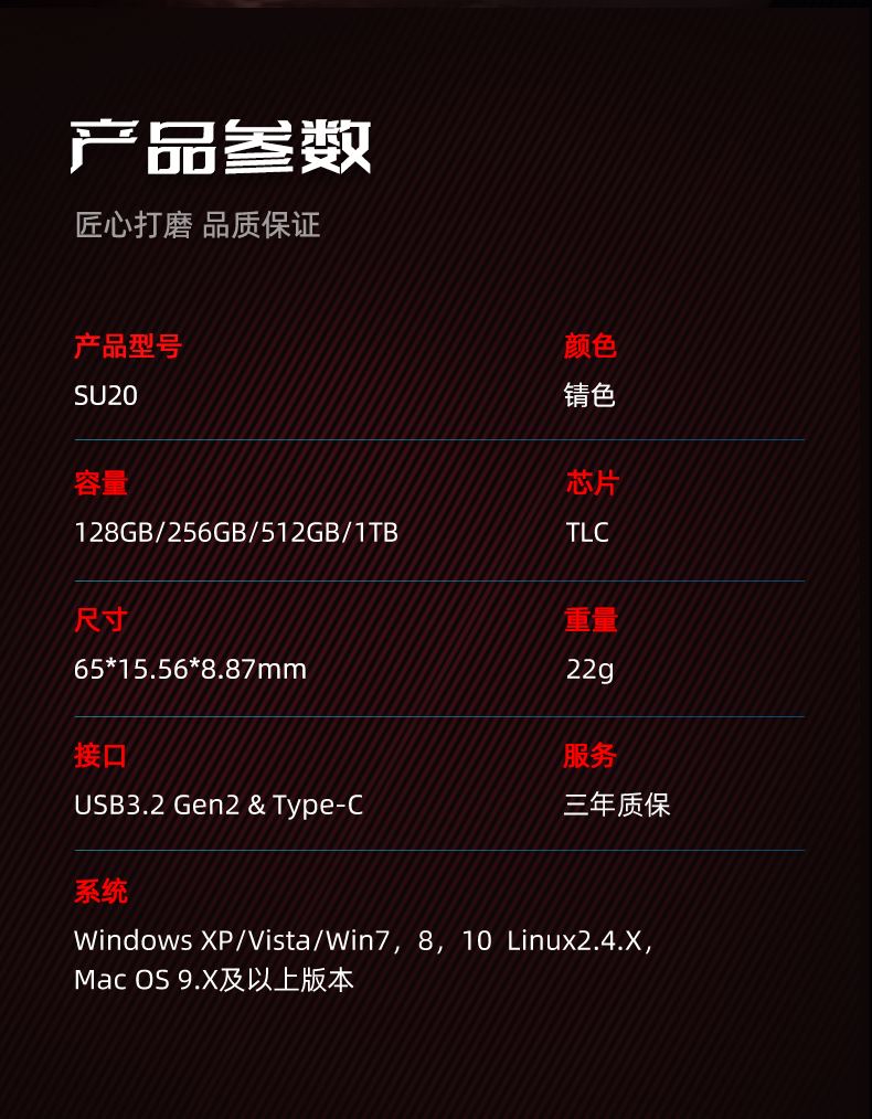 采用Type-c接口 、USB3.2 Gen2双接口传输 USB3.2固态高速传输 锖色电镀金属效果,美观大气 专属礼盒包装,送礼佳品。 产品尺寸:66.8*15.5*8.8mm 包装尺寸:135*80*30mm 单品重量:17g