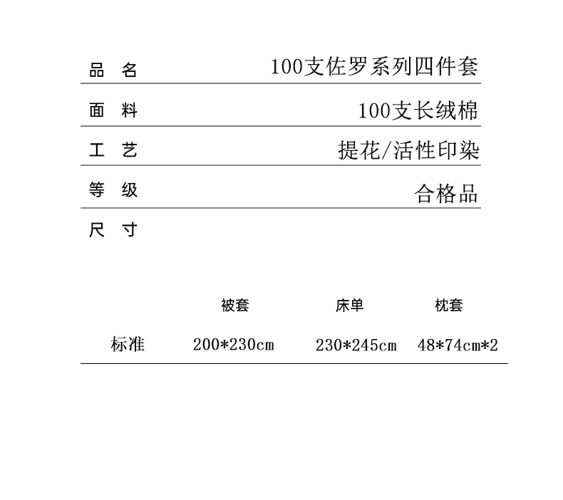 被套:200*230cm 床单:230*245cm 枕套:48*74cm*2 面料:100支长绒棉 产品包装:精美礼盒 包装尺寸:43.5*33*10cm 特点:采用长绒棉棉高密活性印染,洗后不易脱色、不变形、不起球,依然如新。绿色无污染,手感细腻柔软,经纬额度均匀,面料厚实不起球,不缩水。