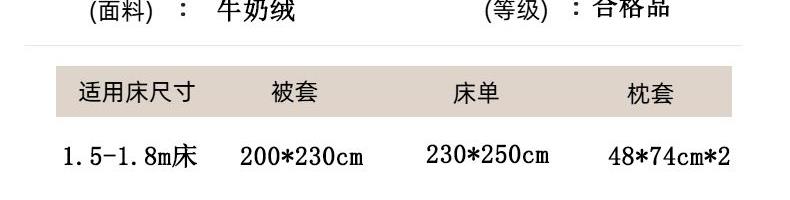 被套:200*230cm 床单:230*250cm 枕套:48*74cm*2 面料:牛奶绒 产品包装:精美礼盒 包装尺寸:50*40*20cm 特点:牛奶绒面料,充分吸收汗气蒸发产生的热量,舒适透气,精美大方,绒感细腻,呵护您娇嫩肌肤新型植绒技术,绒毛结构丰盈紧实,不易掉毛告别掉毛烦恼。