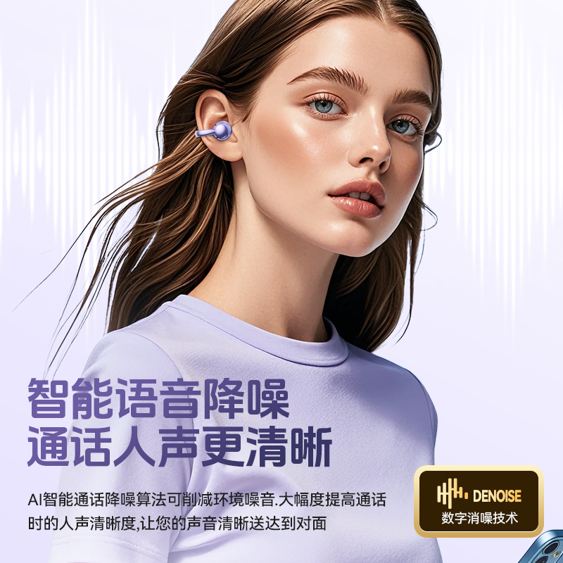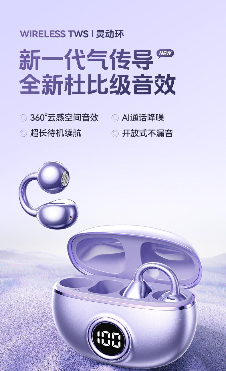 颜色:米色 紫色 黑色 材质:ABS+电镀 容量:耳机30mAh 耳机舱230mAh 包装:彩盒包装 【推荐理由】: 云感耳夹式设计 久戴不累 定向传音技术 V5.4蓝牙版本 智能通话降噪 数字屏电量显示 一目了然 触摸式功能操作
