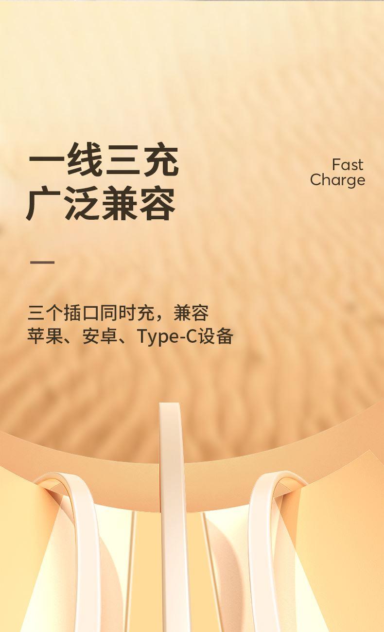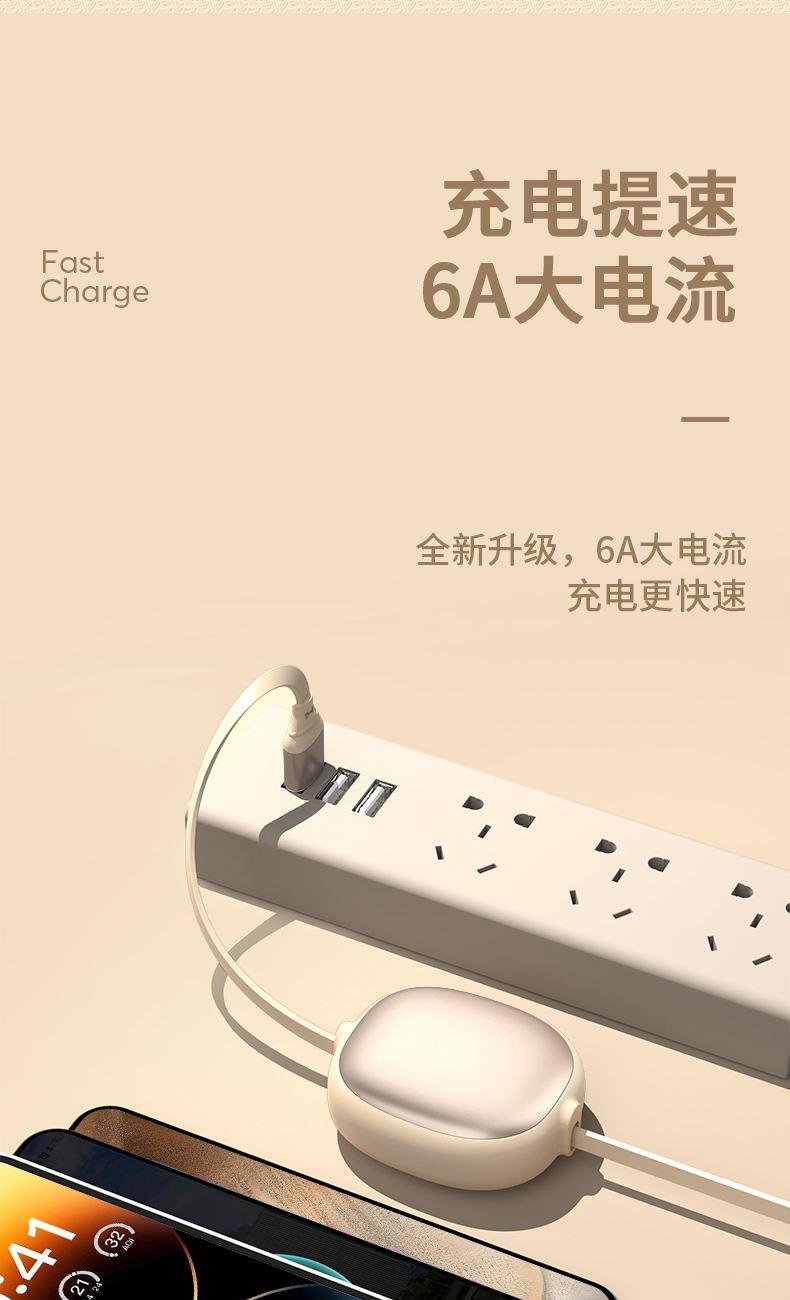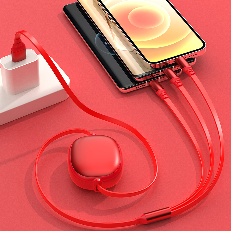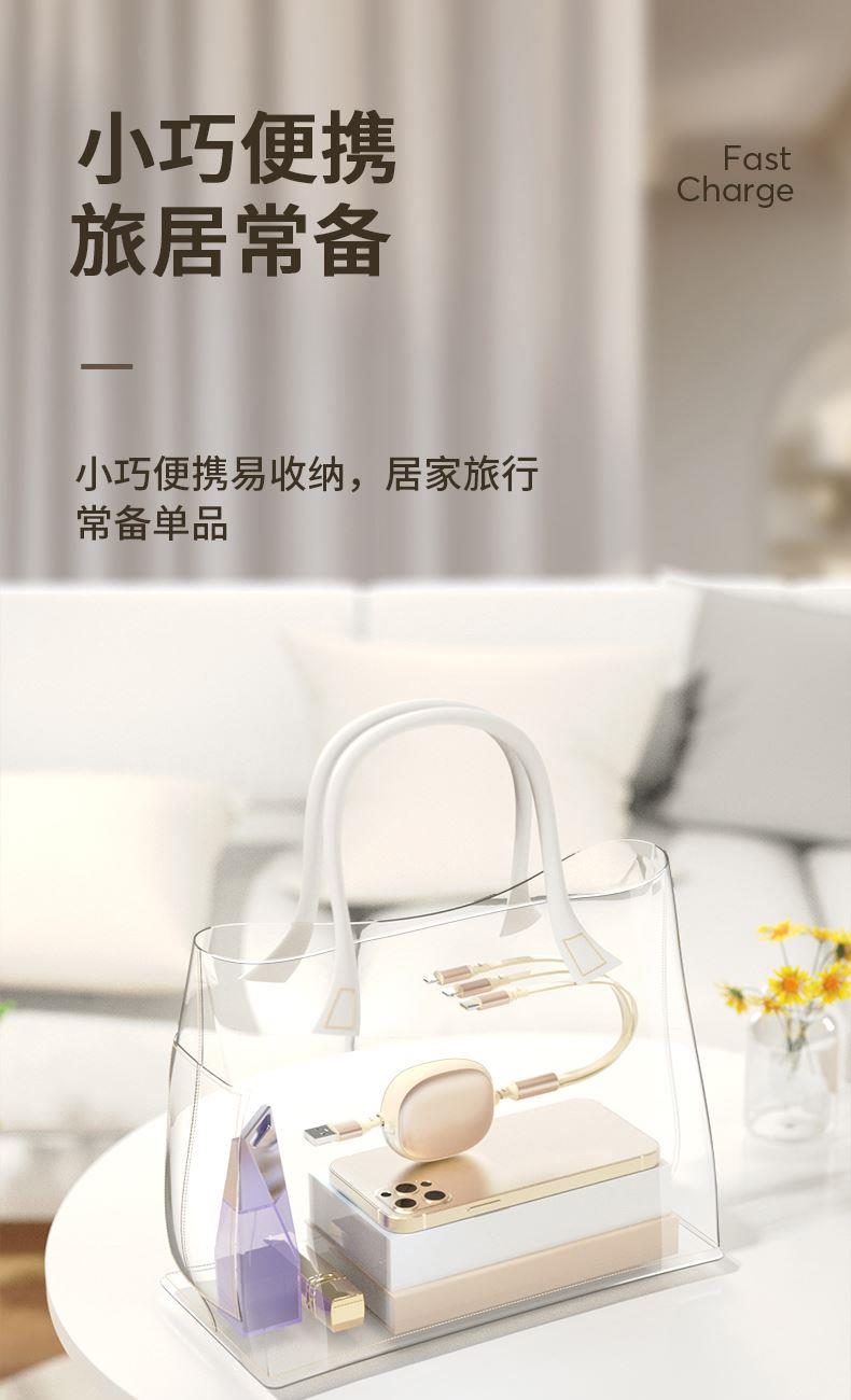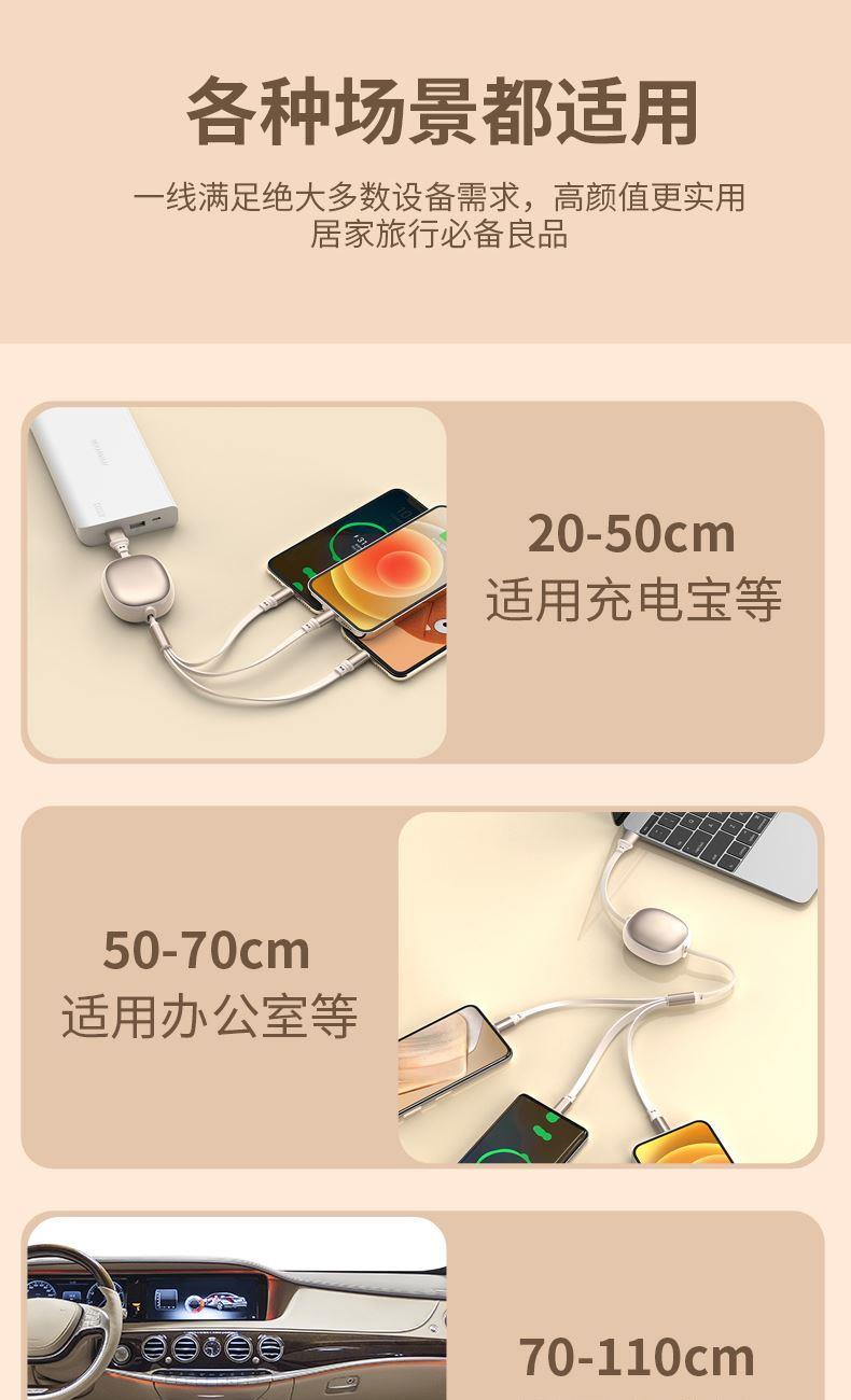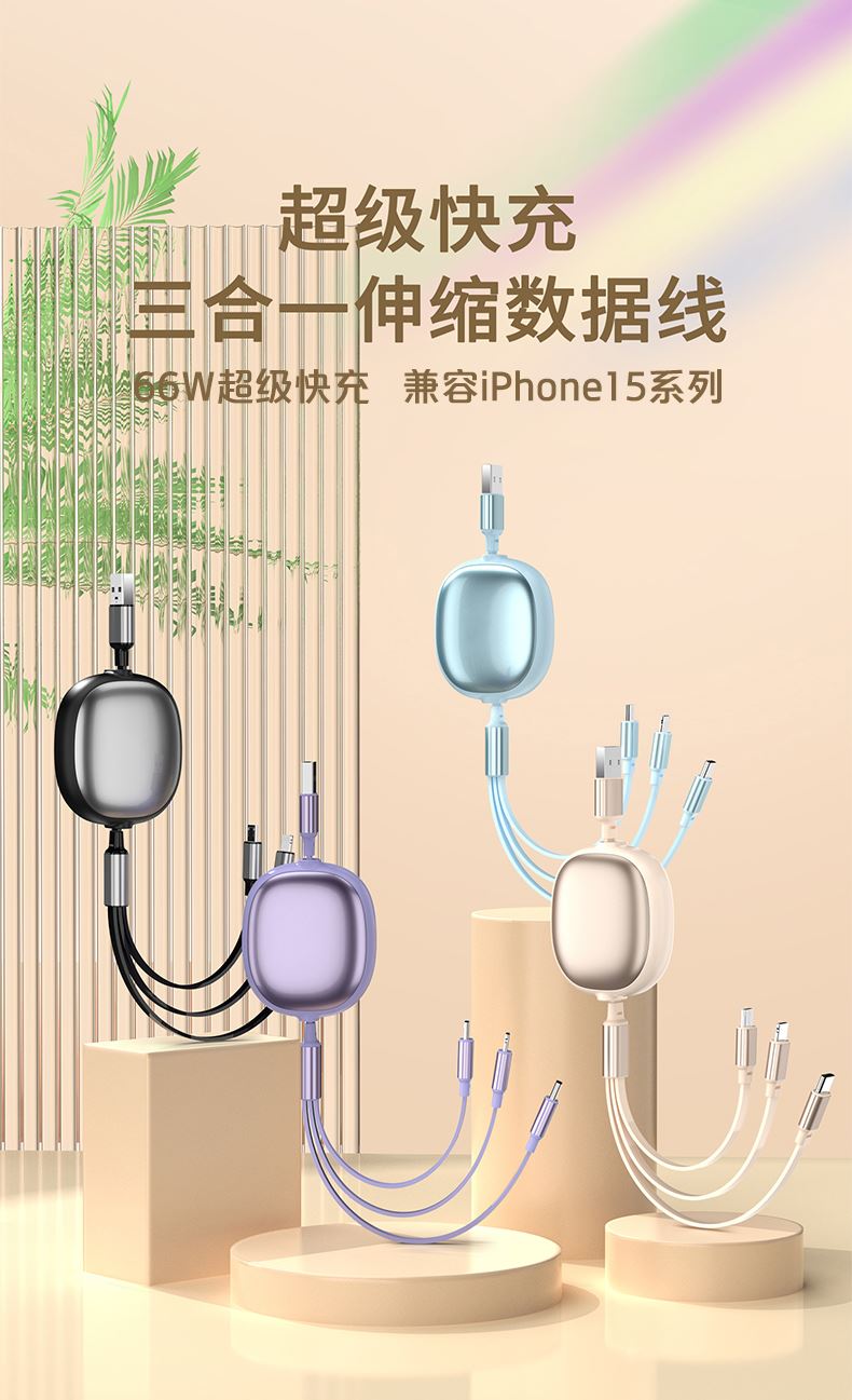 一拖三伸缩设计,兼容苹果15系列 66W超级快充,充电更快 三种接口满足各种手机 1.2米长度设计,使用方便 TPE材质耐用,铝合金面盖 五档伸缩调节