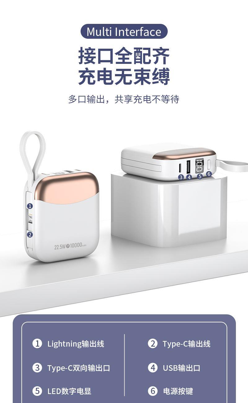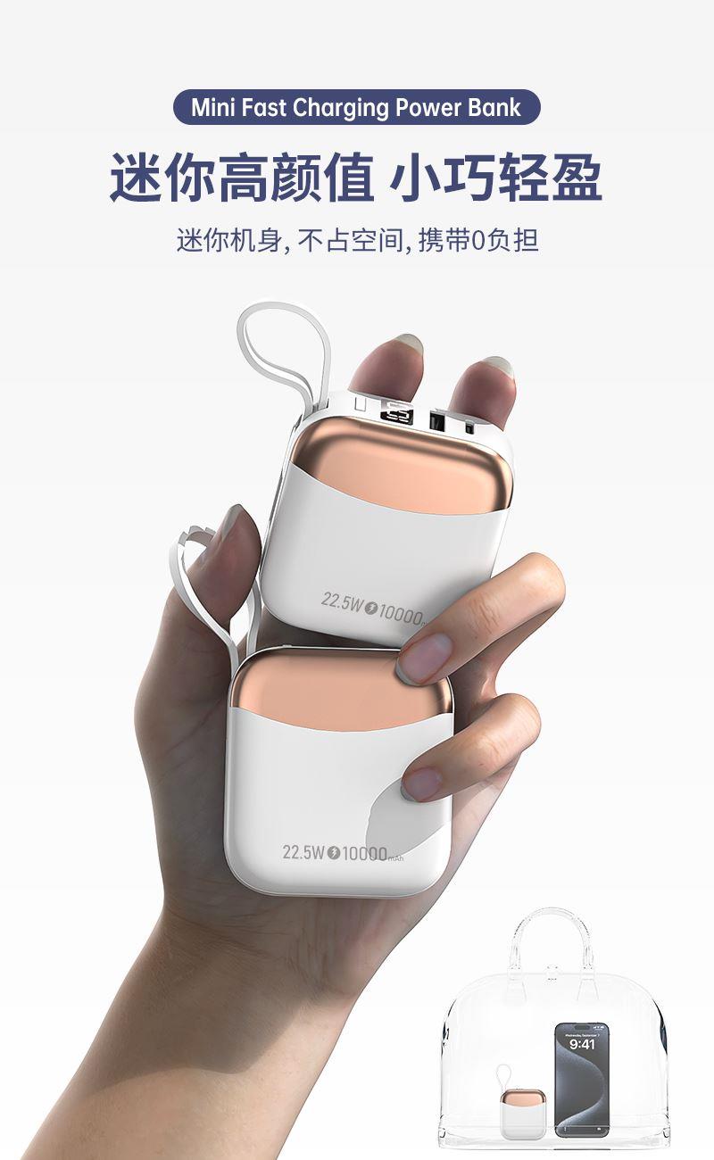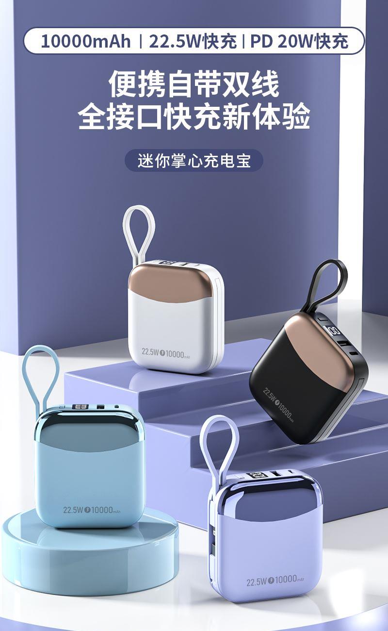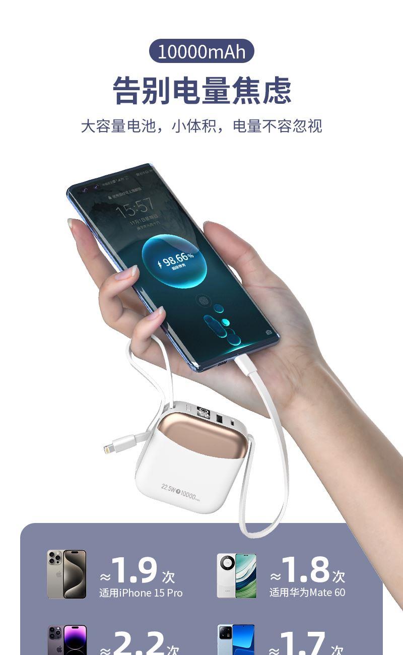 10000毫安实标容量,3C认证 数字电量显示 22.5W超级快充,兼容PD20W 内置苹果/Type-C接口满足各种手机充电 符合民航局标准,可随身携带