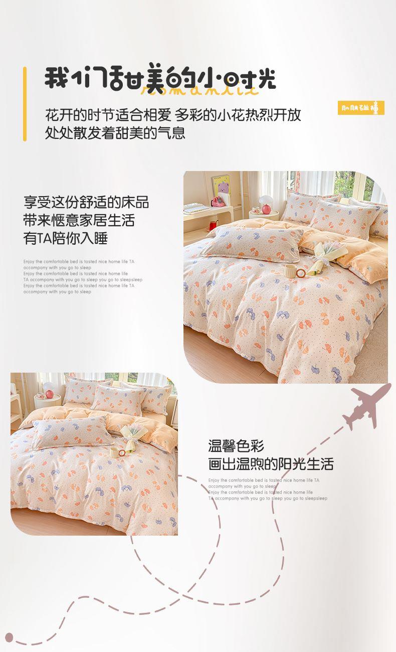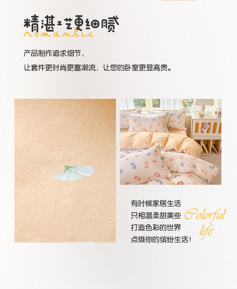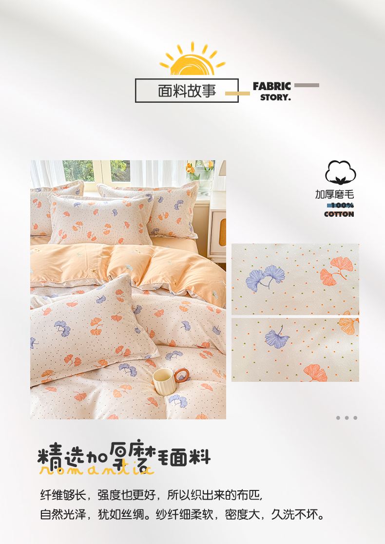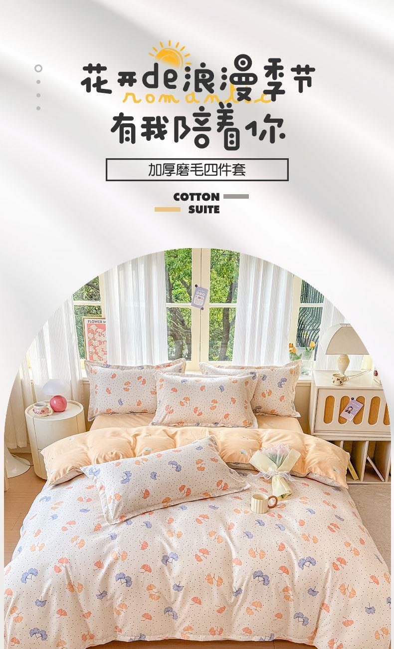 被套:200×230cm 床单:230×230cm 枕套:48×74cm 适用:1.5M-1.8M床 面料:磨绒(聚酯纤维) 印染工艺:环保印花 包装:精美手提盒 甄选柔肤棉面料,质地柔软 细腻,搭配时尙印花点缀柔和色彩的选择 手感舒适亲肤细腻 ,一起感受美好邂逅。