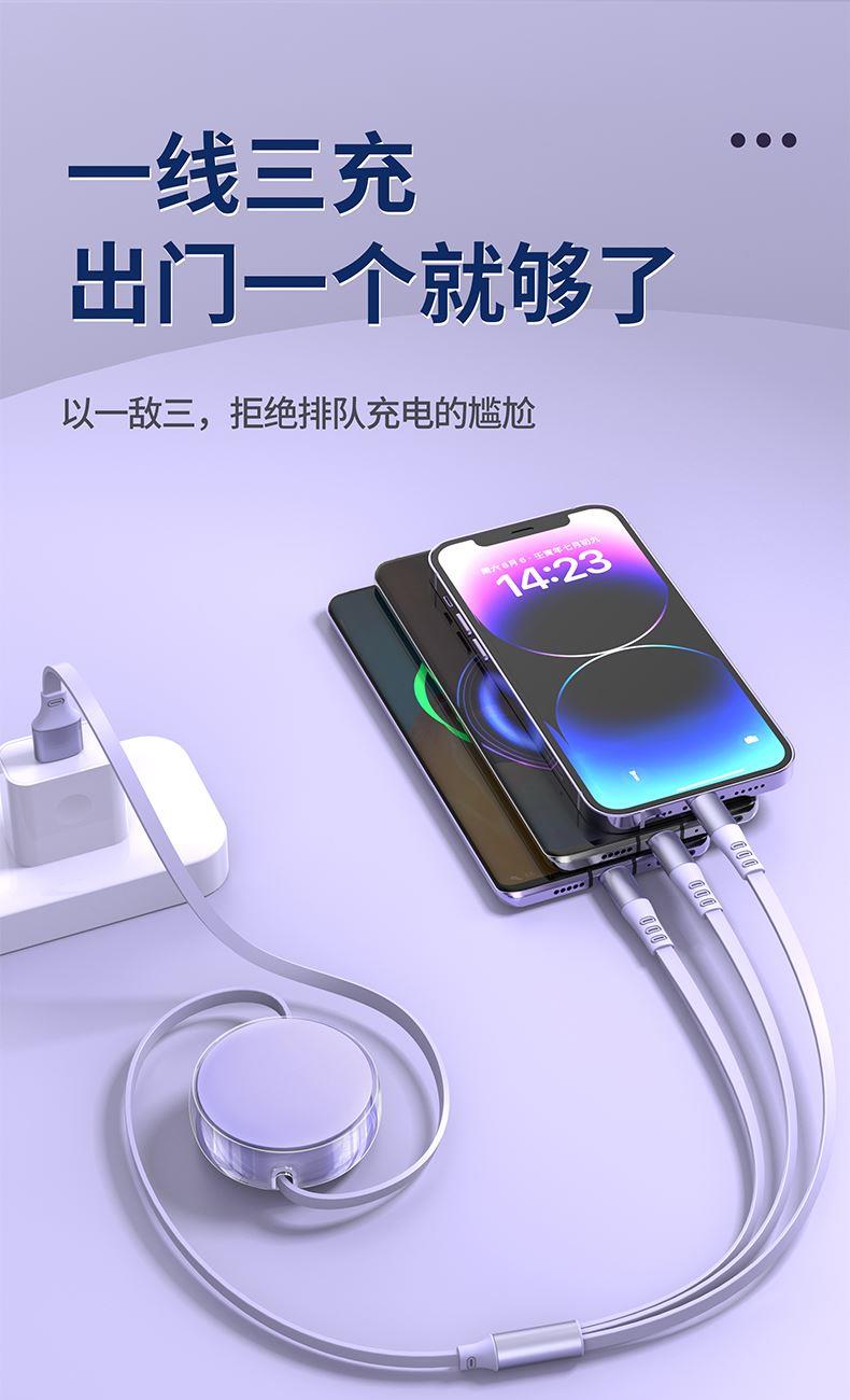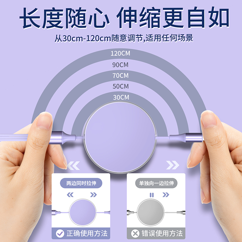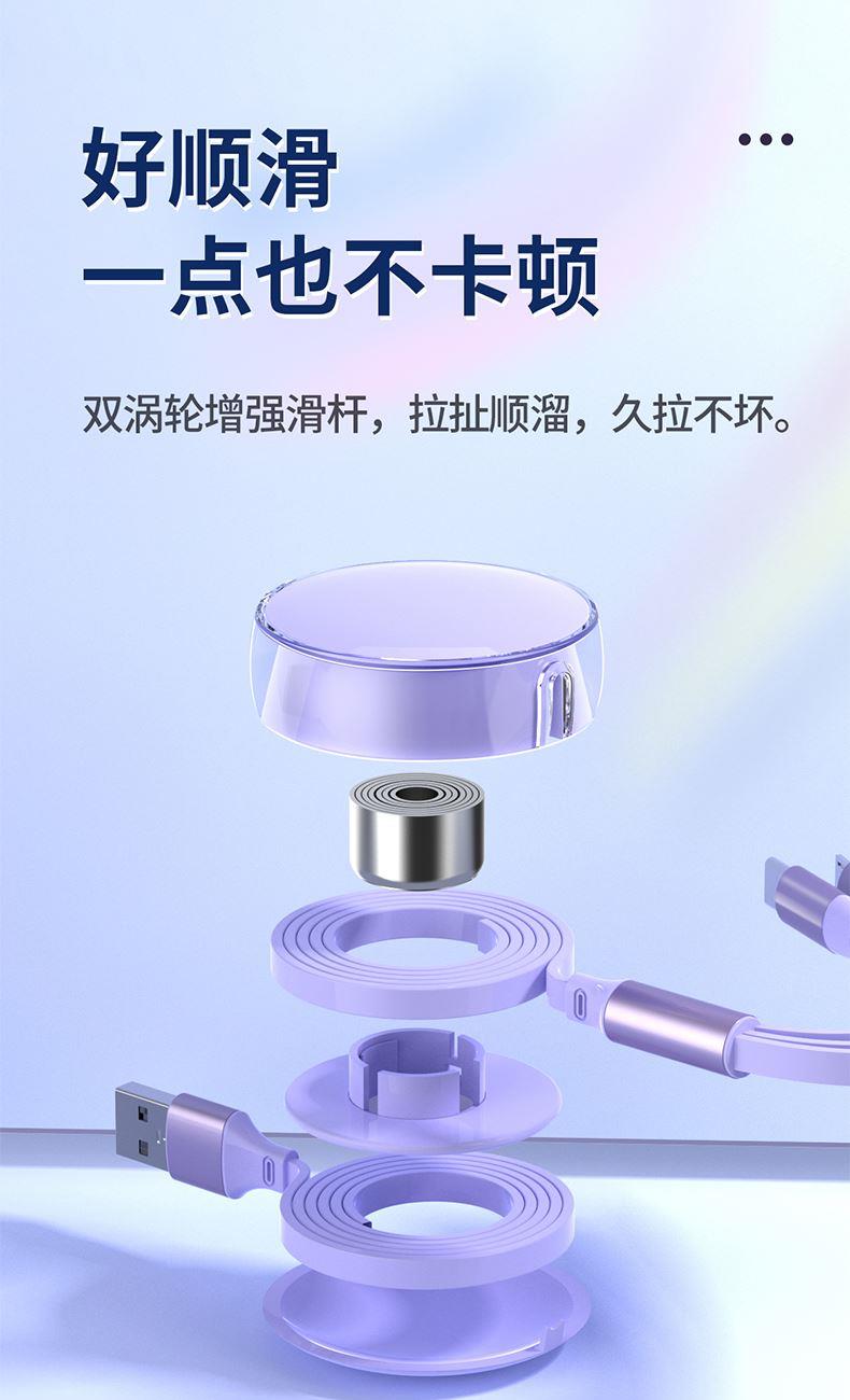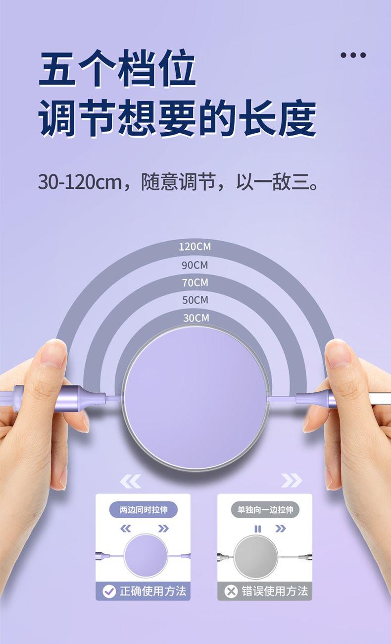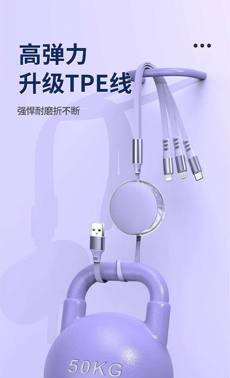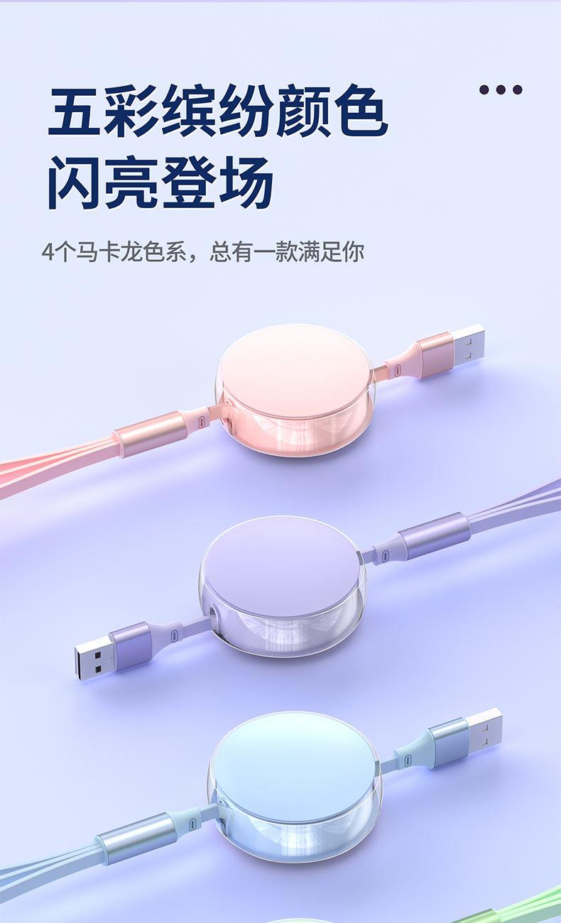 66W超级快充,马卡龙配色 三种接口满足各种手机 1.2米长度设计,使用方便 TPE材质耐用,不易折断 五档伸缩调节