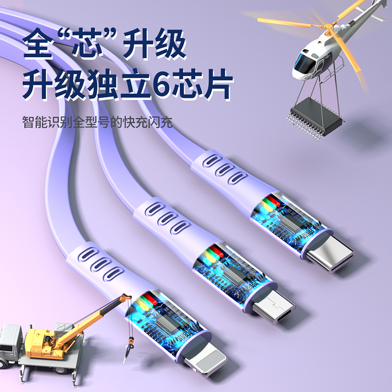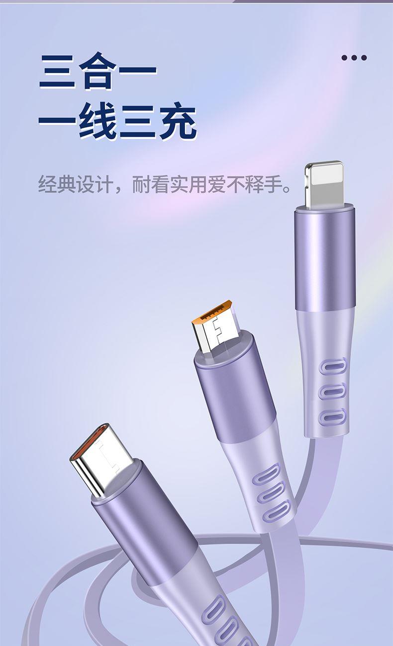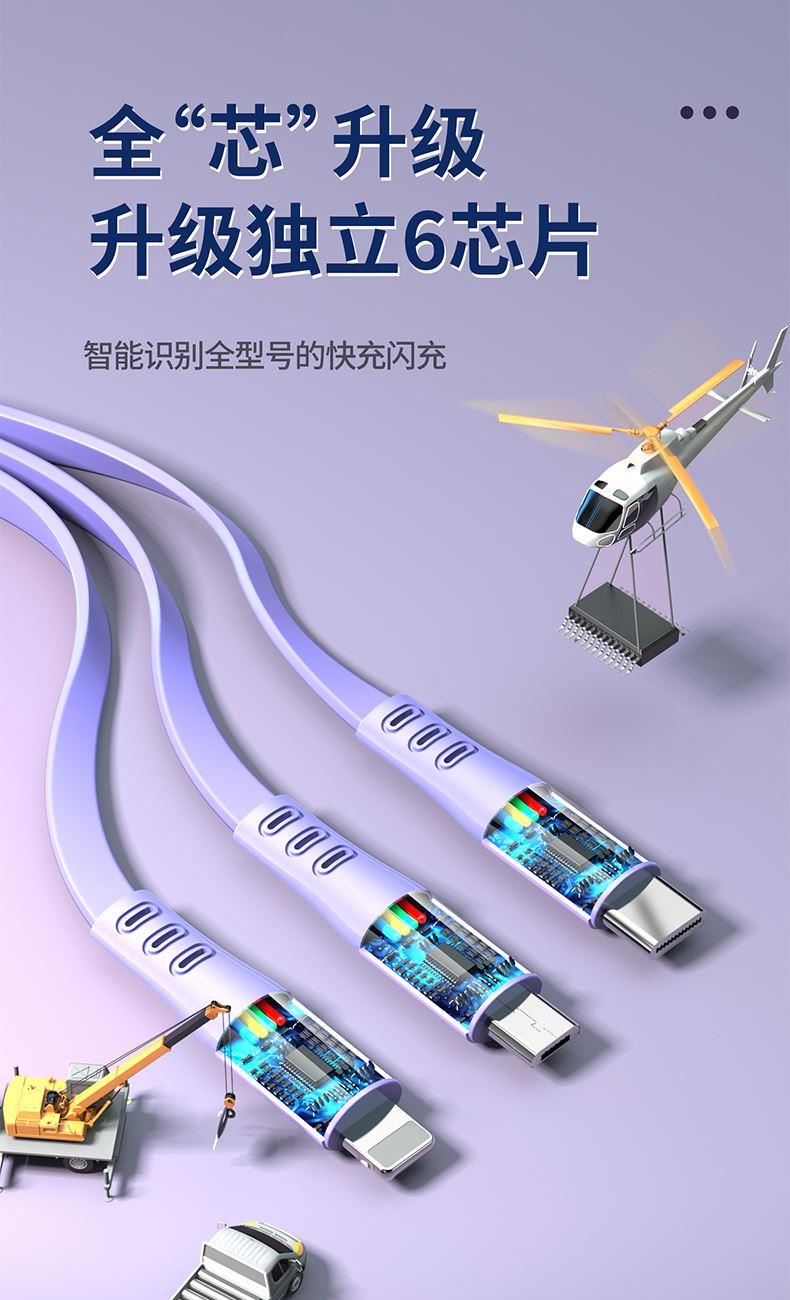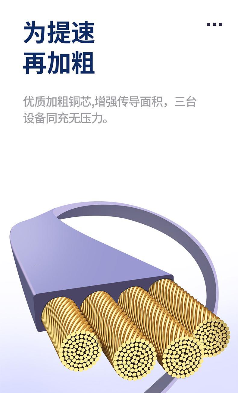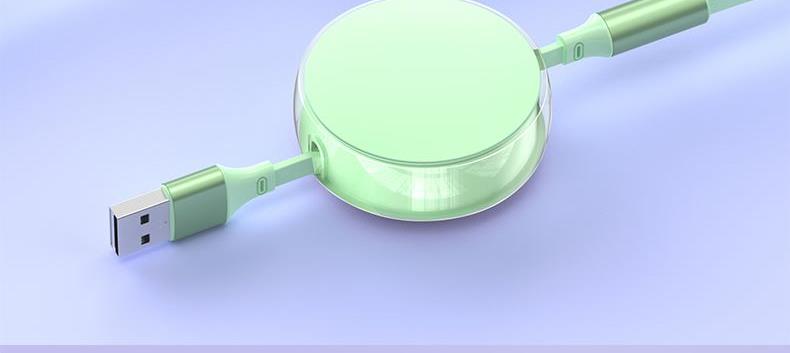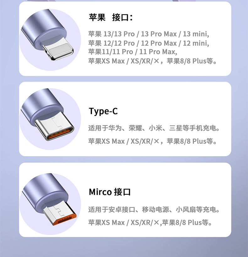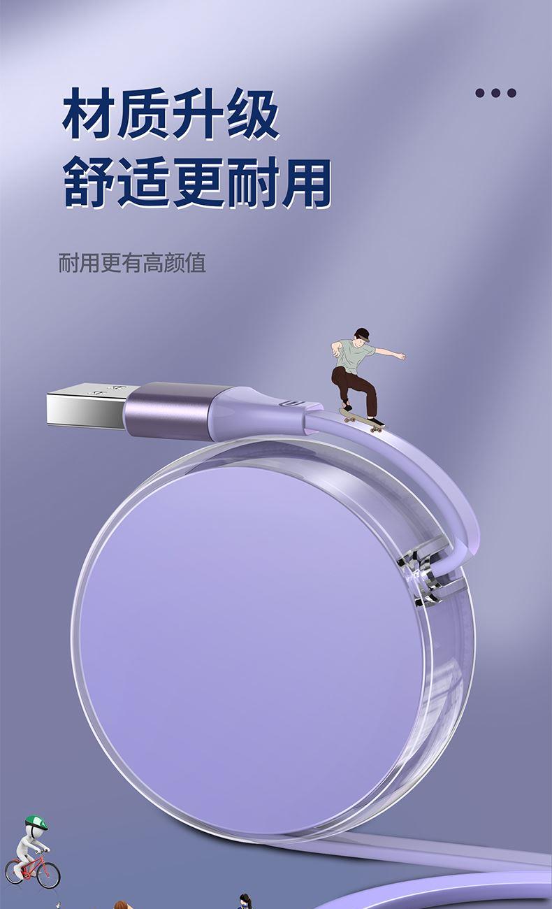 66W超级快充,马卡龙配色 三种接口满足各种手机 1.2米长度设计,使用方便 TPE材质耐用,不易折断 五档伸缩调节