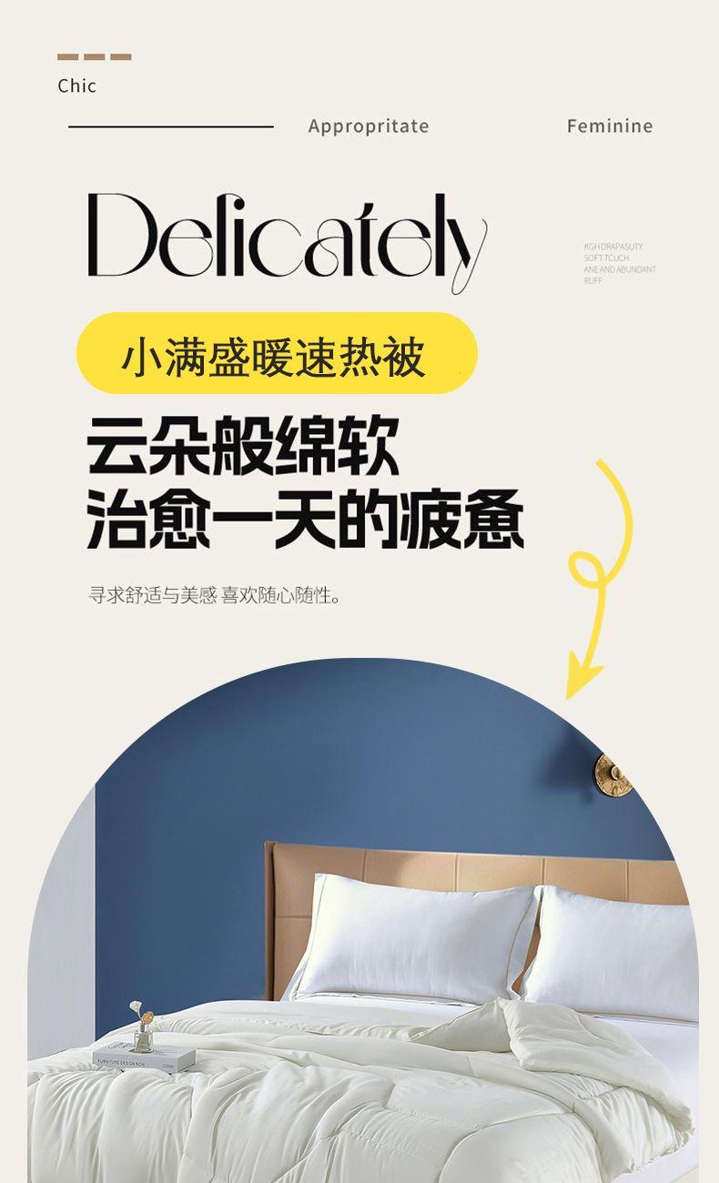 规格:200*230cm 面料:亲肤棉 填充:速热纤维 重量:2000g 执行标准:GB/T22796-2021 安全类别:GB18401-2010 B类 1.精选速热纤维填充,接触肌肤瞬间触发温暖效应,告别被窝冰凉感。 2.立体蓬松结构,既能牢牢锁住身体散发的热量,又能保持空气流通,温暖干爽不闷汗。 3.亲肤棉面料温柔包裹,肌肤仿佛沉浸于云端,带来一整夜的安适与放松。