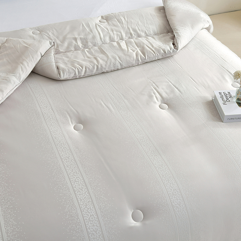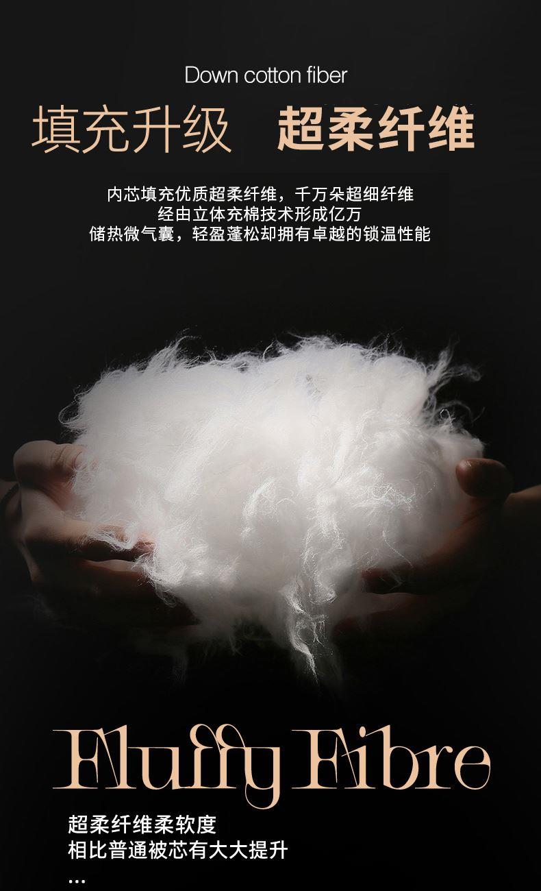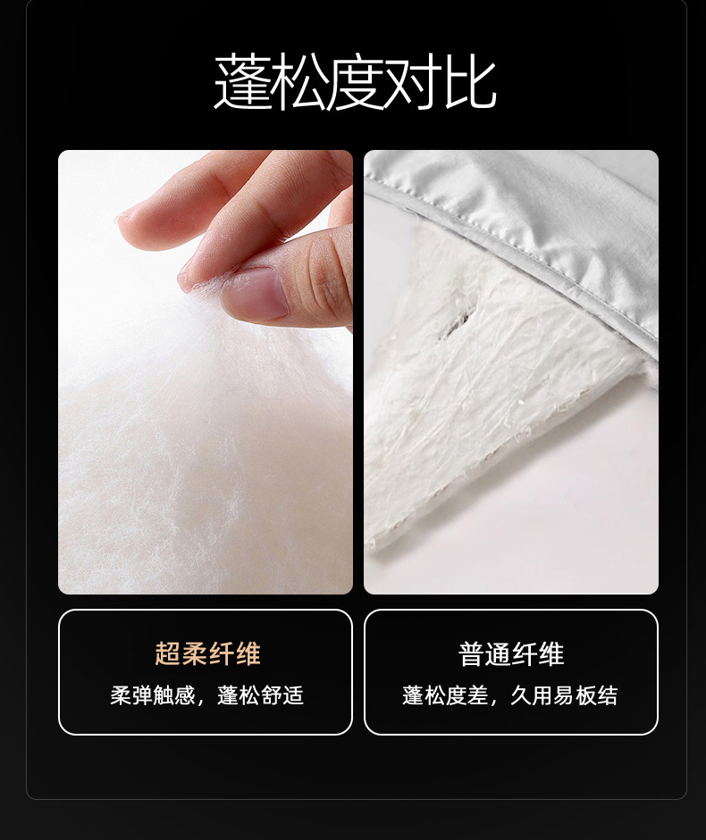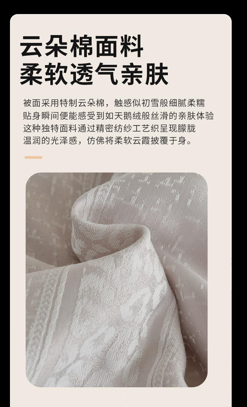 规格:200*230cm 面料:云朵棉 填充:超柔纤维 重量:2800g 执行标准:GB/T22796-2021 安全类别:GB18401-2010 B类 1被面采用特制云朵棉,触感似初雪般细腻柔糯,贴身瞬间便能感受到如天鹅绒般丝滑的亲肤体验。这种独特面料通过精密纺纱工艺织就,呈现朦胧温润的光泽感,仿佛将柔软云霞披覆于身。 2.内芯填充优质羽丝棉,千万朵超细纤维经由立体充棉技术形成亿万储热微气囊,轻盈蓬松却拥有较好的锁温性能。