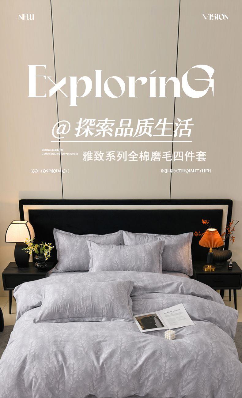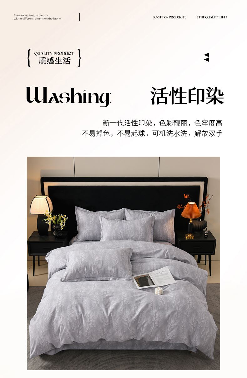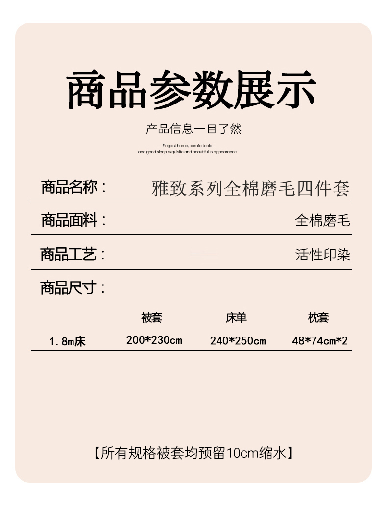 被套:200*230cm 床单:240*250cm 枕套:48*74cm*2 面料:全棉磨毛 ▶全棉磨毛,纤维柔长,绒毛更加丰盈密集,柔软细腻,亲肤呵护,保暖加倍。 ▶采用活性印染工艺,色彩靓玉,耐洗不易褪色,久用如新。