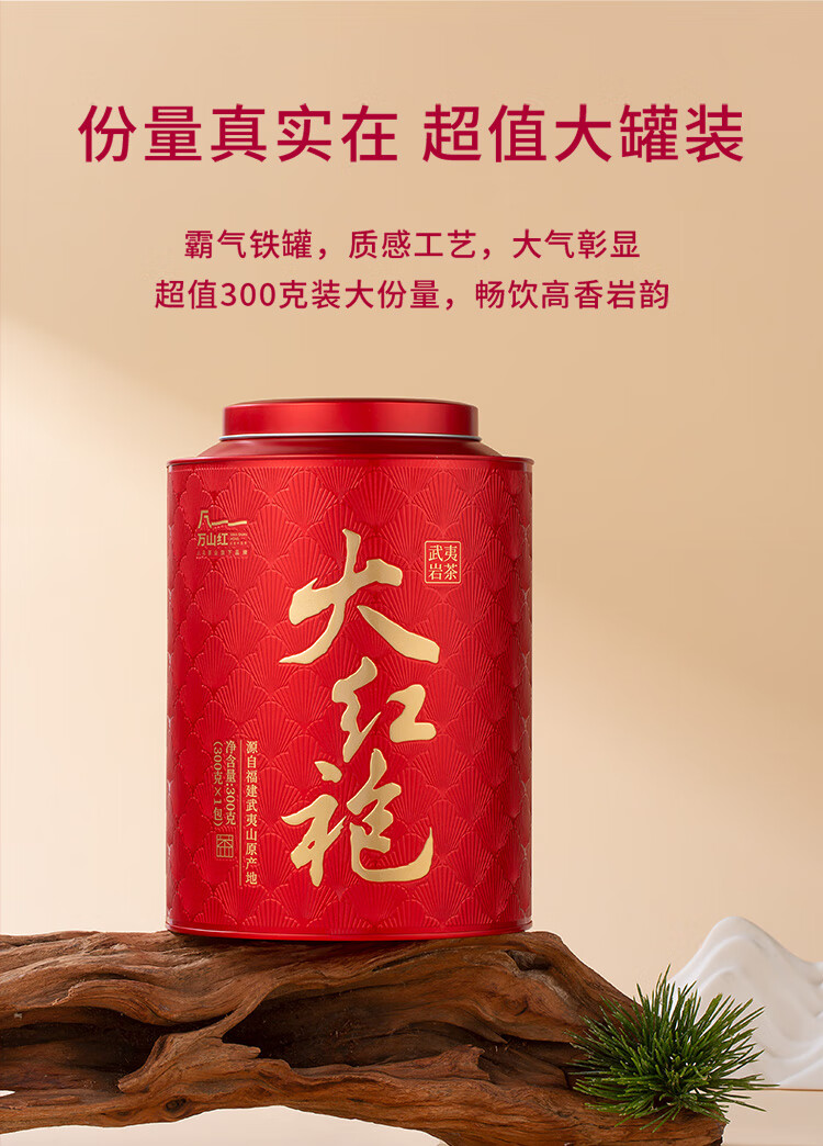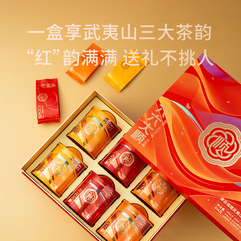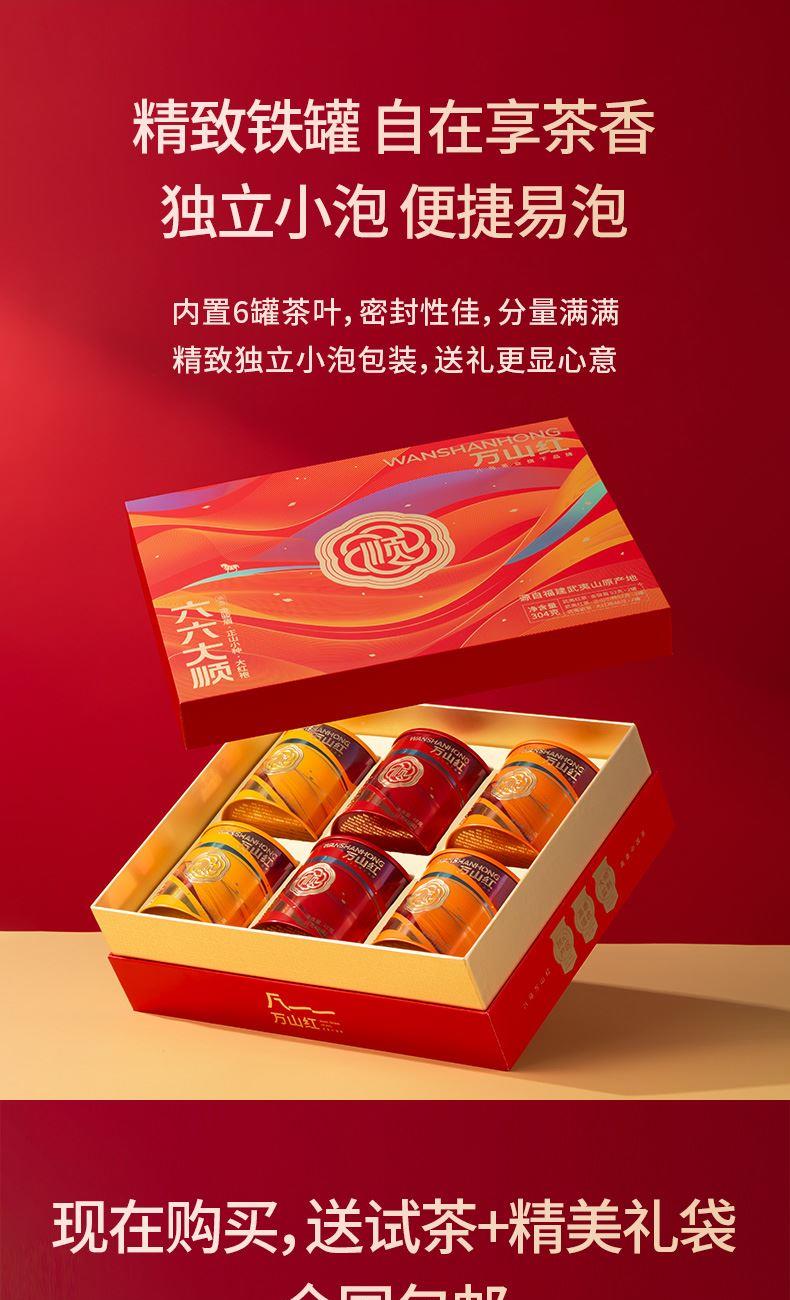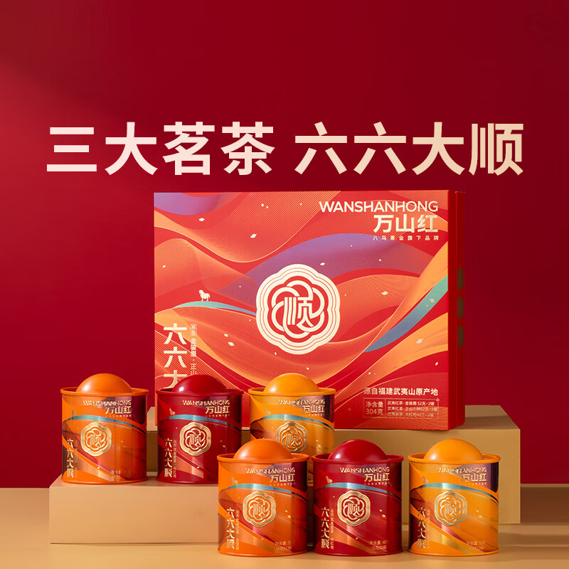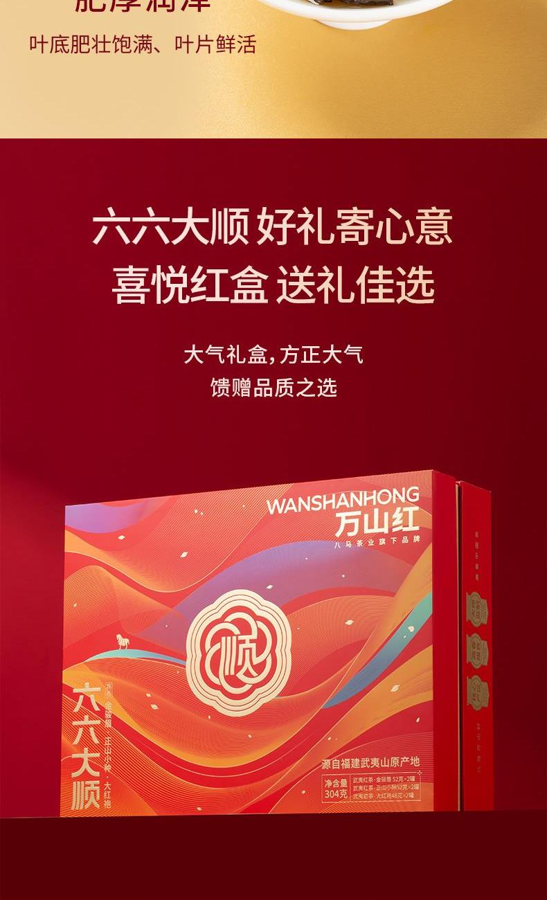 礼盒内配: 大红袍48克X2罐;金骏眉52克X2罐;正山小种52克X2罐 净含量:304g 单罐内配:大红袍300克 净含量:300g 推荐理由: 自饮一罐,送礼一盒; - 产品组合:涵盖武夷原产三大名茶,以“六六大顺”为主题打造礼盒,内含多罐不同品类茶叶,一次可品鉴多种武夷茗茶风味,满足多样饮茶需求。 - 包装与寓意:国潮风礼盒设计,色彩喜庆且富有文化感,“顺”字元素与“六六大顺”的命名,兼具送礼的祝福寓意与收藏价值,是节日、商务馈赠的优质选择。 - 产地与工艺:源自福建武夷山原产地,采用传统焙火工艺制作,保证地道岩茶的风味特质,是正宗武夷大红袍的典型代表。 - 品质与口感:滋味醇浓,茶香浓郁且耐泡,冲泡后香气持久、茶汤醇厚,能带给饮茶者丰富的味觉与嗅觉体验。 - 规格与场景:实在大罐包装,容量充足,无论是自饮囤茶还是送礼都很适宜,满足日常品饮或分享的需求。