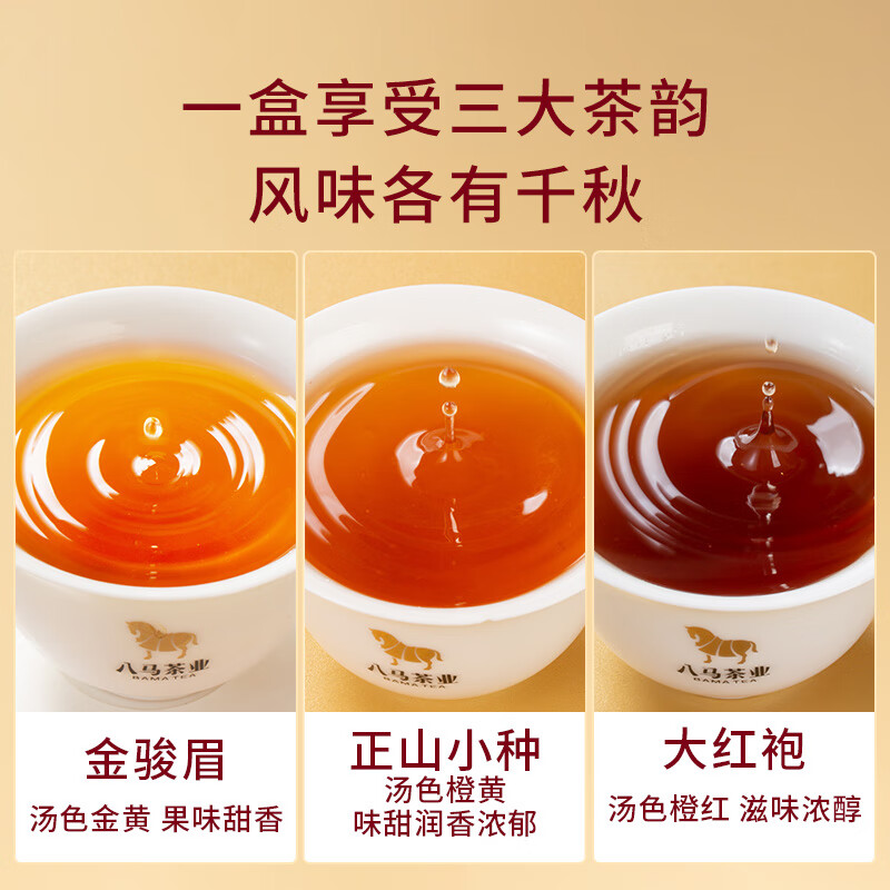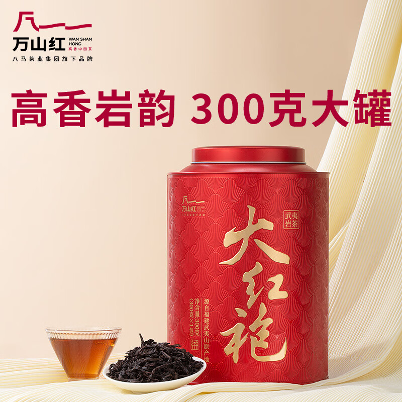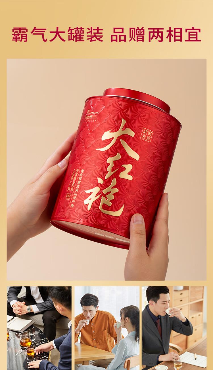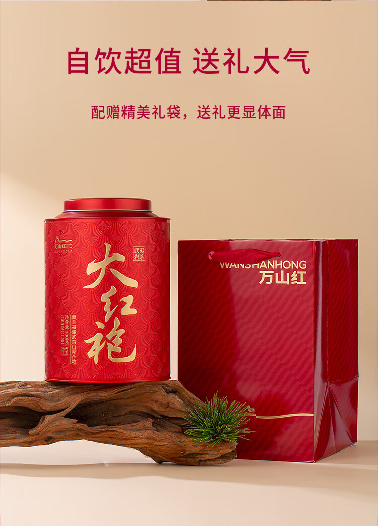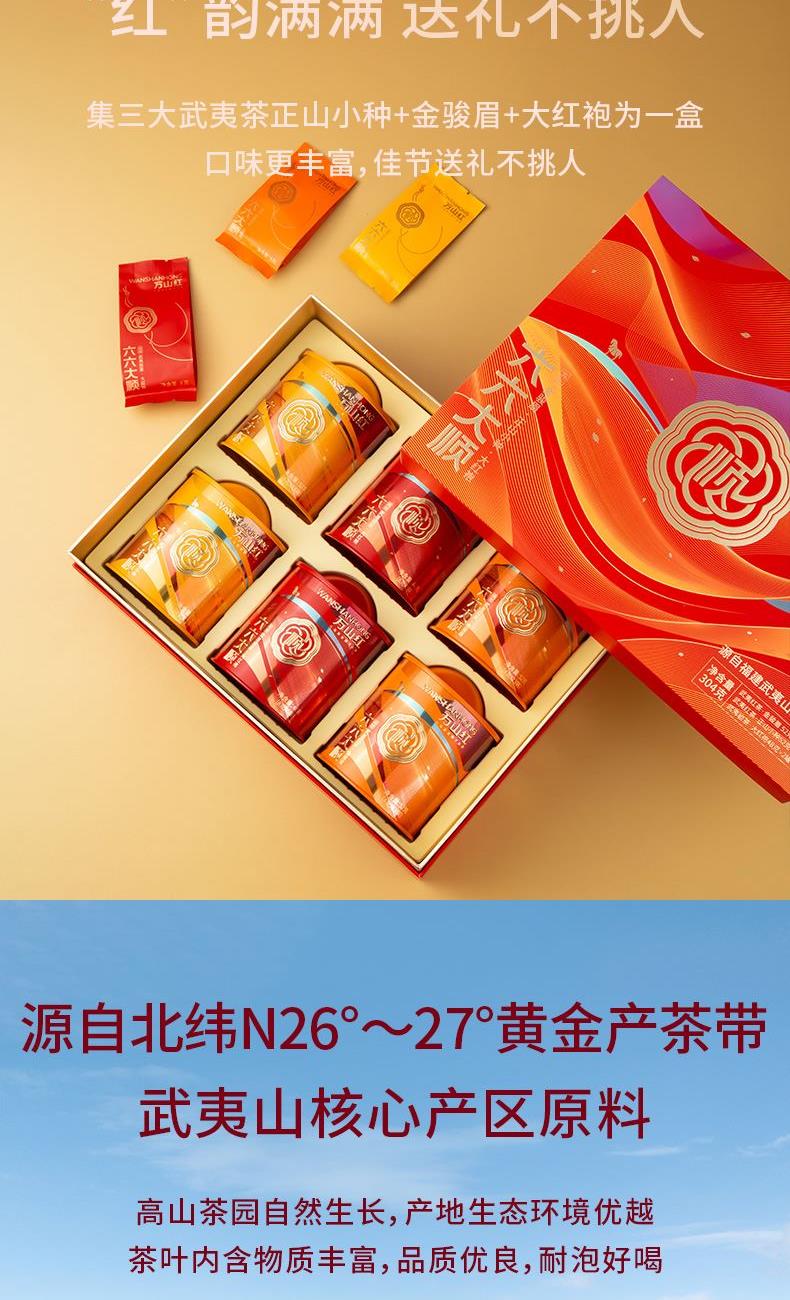 礼盒内配: 大红袍48克X2罐;金骏眉52克X2罐;正山小种52克X2罐 净含量:304g 单罐内配:大红袍300克 净含量:300g 推荐理由: 自饮一罐,送礼一盒; - 产品组合:涵盖武夷原产三大名茶,以“六六大顺”为主题打造礼盒,内含多罐不同品类茶叶,一次可品鉴多种武夷茗茶风味,满足多样饮茶需求。 - 包装与寓意:国潮风礼盒设计,色彩喜庆且富有文化感,“顺”字元素与“六六大顺”的命名,兼具送礼的祝福寓意与收藏价值,是节日、商务馈赠的优质选择。 - 产地与工艺:源自福建武夷山原产地,采用传统焙火工艺制作,保证地道岩茶的风味特质,是正宗武夷大红袍的典型代表。 - 品质与口感:滋味醇浓,茶香浓郁且耐泡,冲泡后香气持久、茶汤醇厚,能带给饮茶者丰富的味觉与嗅觉体验。 - 规格与场景:实在大罐包装,容量充足,无论是自饮囤茶还是送礼都很适宜,满足日常品饮或分享的需求。