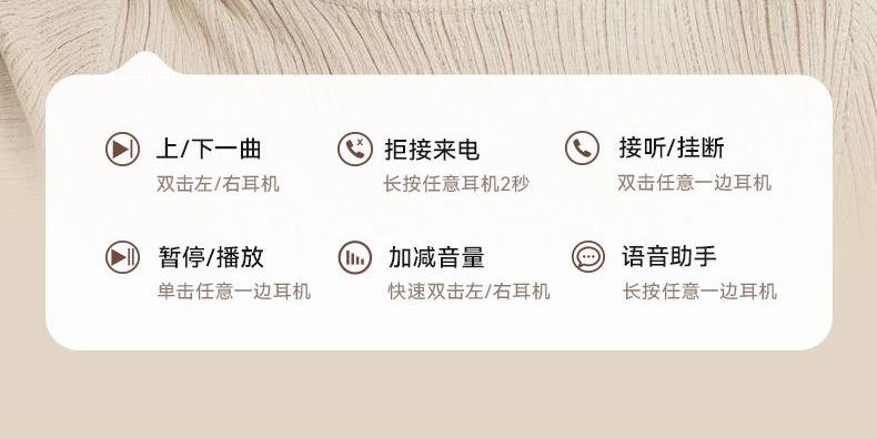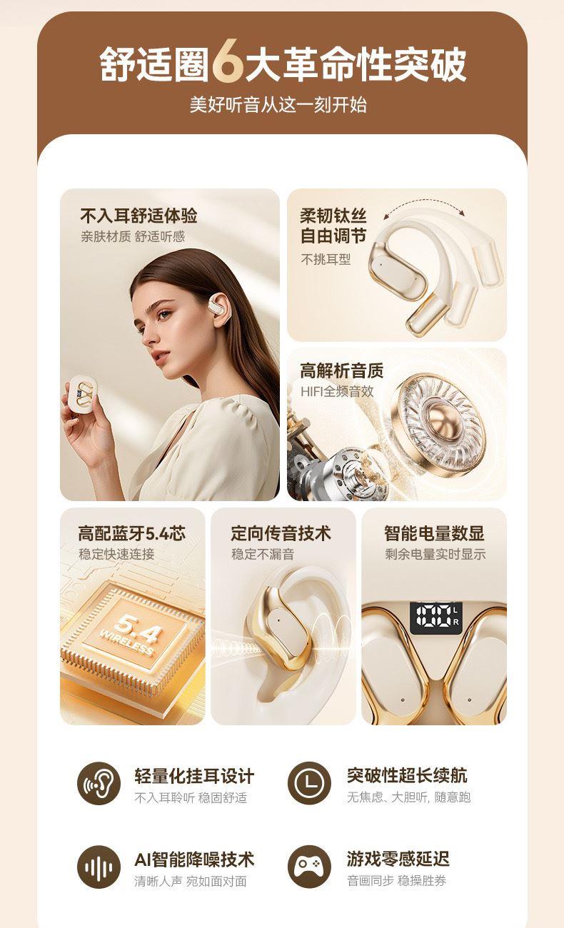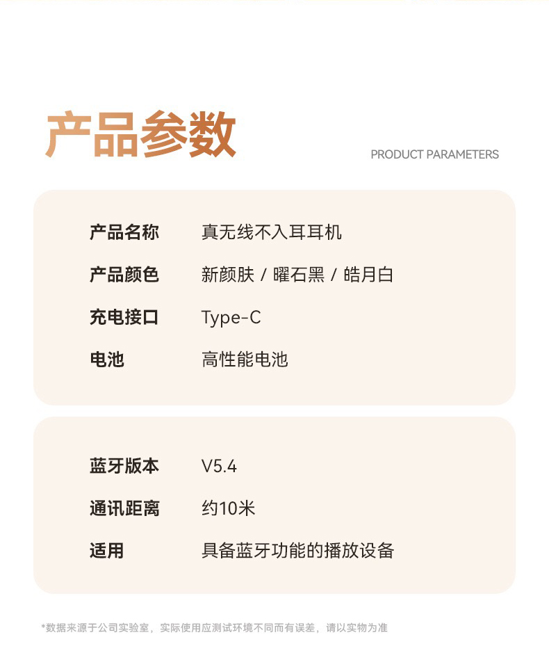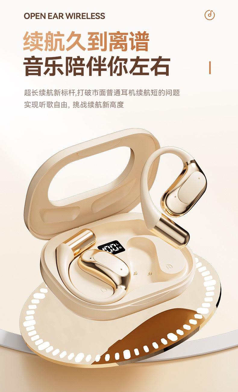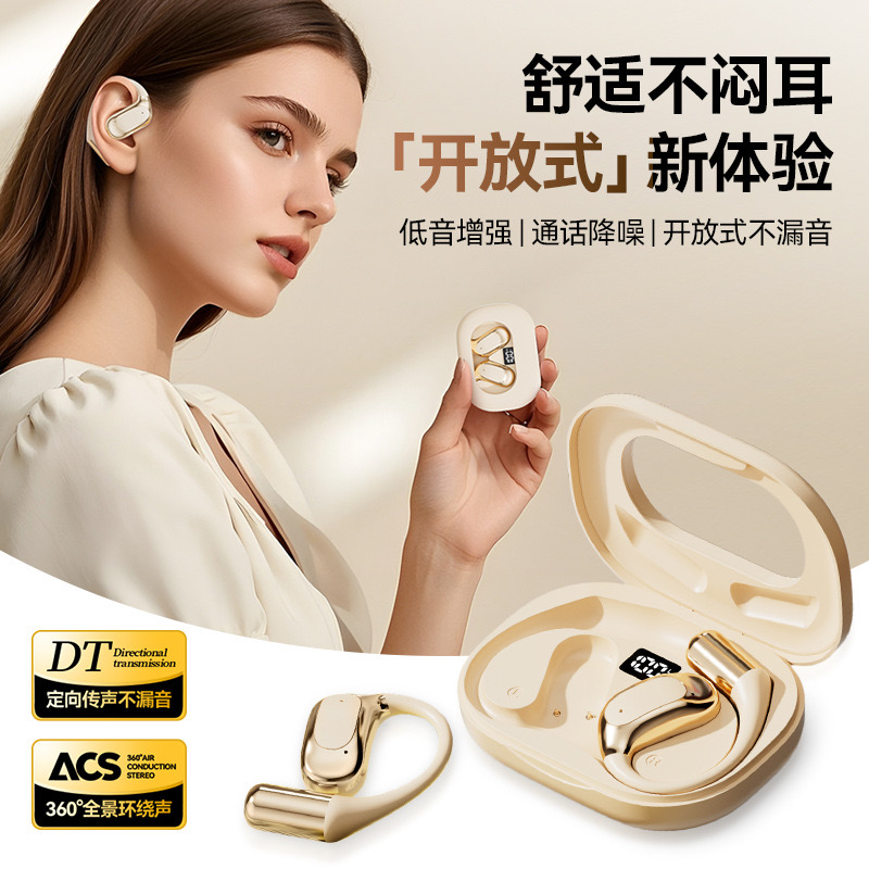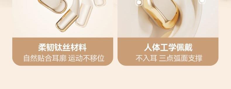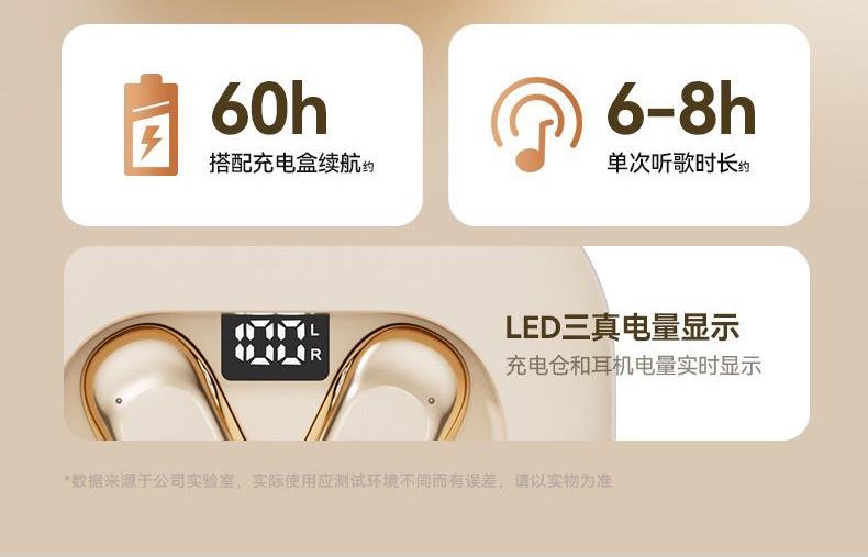 颜色:米色 黑色 材质:ABS+电镀 容量:耳机40mAh 耳机舱300mAh 包装:彩盒包装 【推荐理由】: 云感佩戴挂耳设计 久戴不累 定向传音技术 V5.4蓝牙版本 智能通话降噪 数字屏电量显示 一目了然 触摸式功能操作