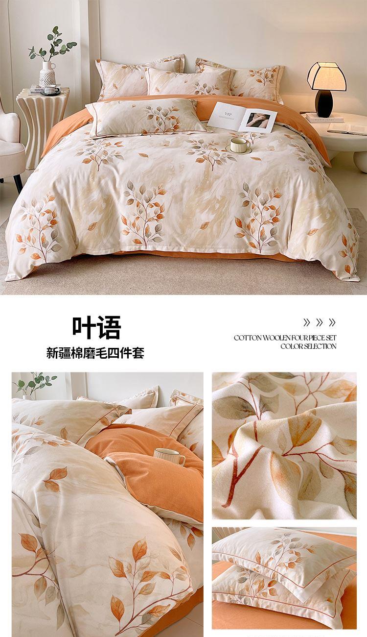 被套:200*230cm 床单:245*250cm 枕套:48*74cm*2 面料:生态磨毛 产品包装:精美礼盒 包装尺寸:52*36*10cm 1.磨毛面料柔软、温暖、舒适,而且磨毛产品不会 褪色、起球。 2.通过经精湛的磨毛工艺,使得手感柔软、舒适。