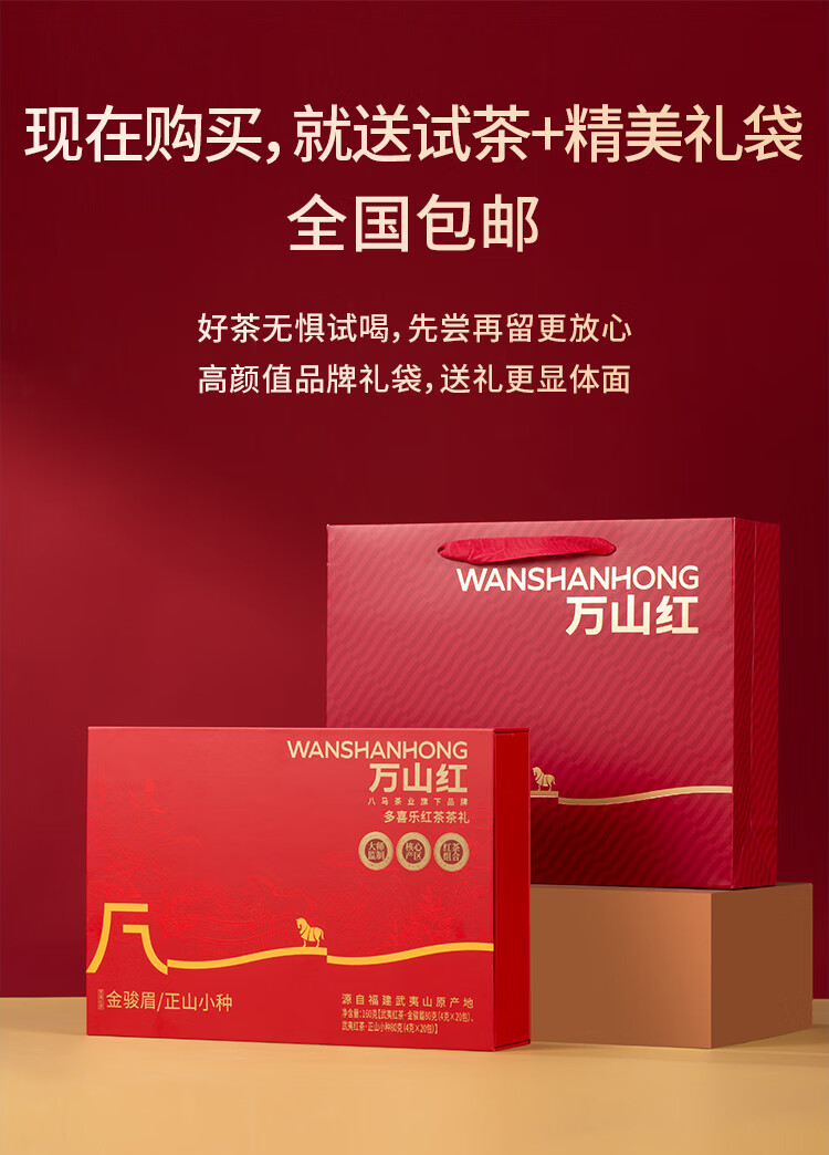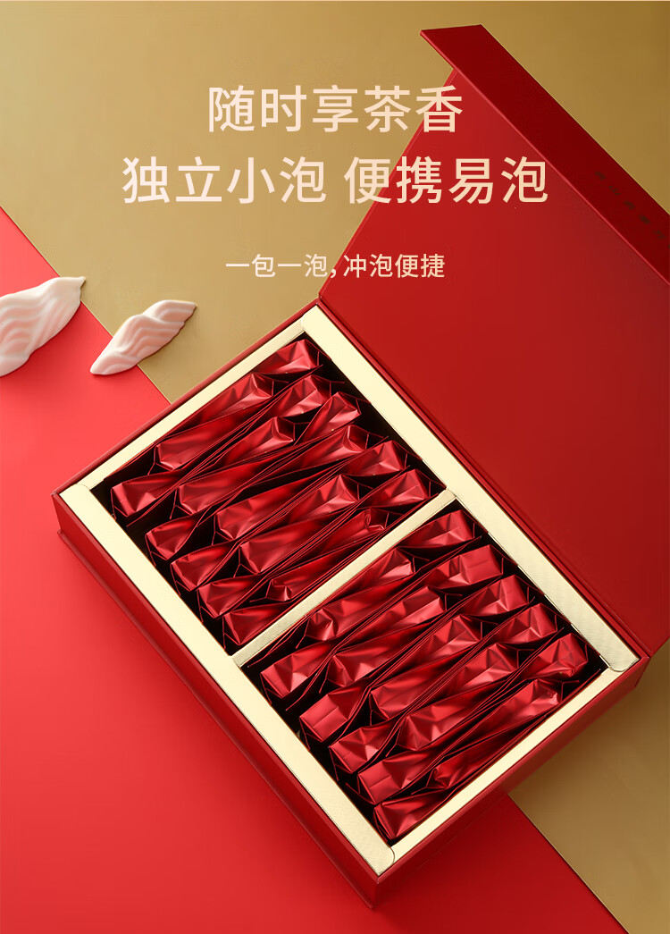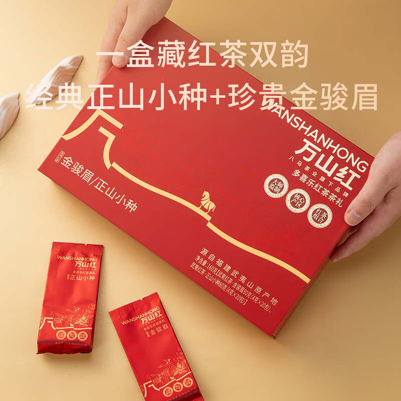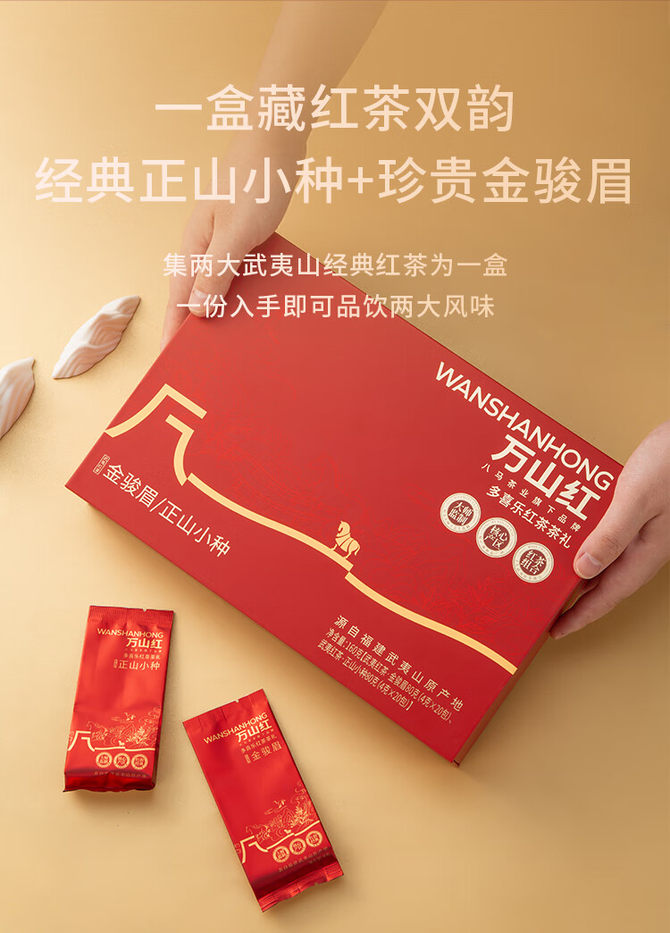 礼盒内配: 武夷岩茶·金骏眉80克(4克*20包) 武夷岩茶·正山小种80克(4克*20包) 净含量:160g 单罐内配:茉莉花茶·茉莉小白毫-300克(4克×75包) 净含量:300g 推荐理由: 自饮一罐,送礼一盒 推荐理由; 1. 品质双优,口感互补:两款茶叶均选用优质原料制作,一款茶香醇厚回甘明显,另一款香气清新淡雅,满足不同口感偏好,无论是日常自饮还是交替品鉴都十分合适。 2. 包装精致,场景适配广:产品包装简约大气,兼具质感与实用性,既适合居家收纳保存茶叶,也可作为轻礼赠送亲友。日常办公、休闲下午茶等场景冲泡饮用,能轻松提升饮茶体验。