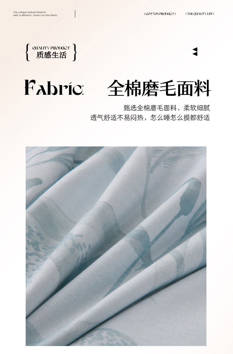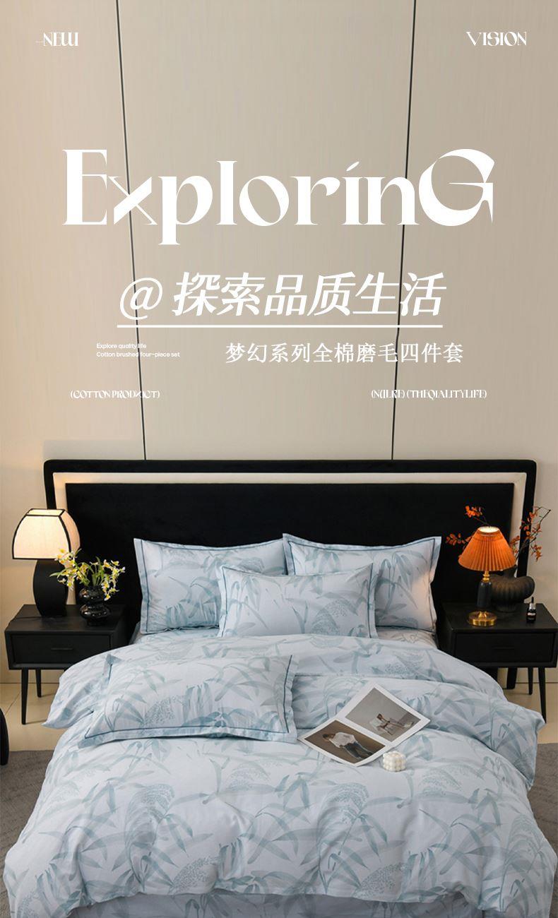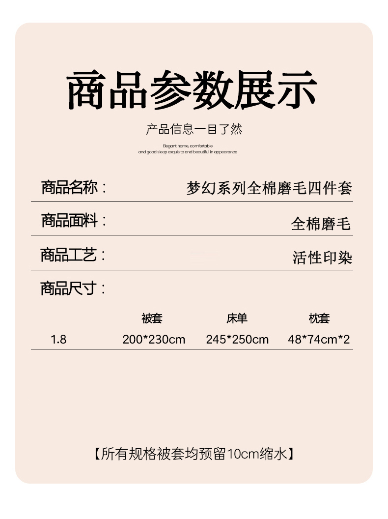 被套:200*230cm 床单:245*250cm 枕套:48*74cm*2 面料:全棉磨毛 产品包装:精美礼盒 1.全棉磨毛,纤维柔长,绒毛更加丰盈密集,柔软细腻,亲肤呵护,保暖加倍。 2.采用活性印染工艺,色彩靓玉,耐洗不易褪色,久用如新。