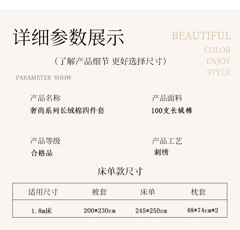 被套:200*230cm 床单:230*245cm 枕套:48*74cm*2 面料:100支长绒棉 产品包装:精美礼盒 包装尺寸:43.5*33*10cm 特点:采用长绒棉棉高密活性印染,洗后不易脱色、不变形、不起球,依然如新。绿色无污染,手感细腻柔软,经纬额度均匀,面料厚实不起球,不缩水。