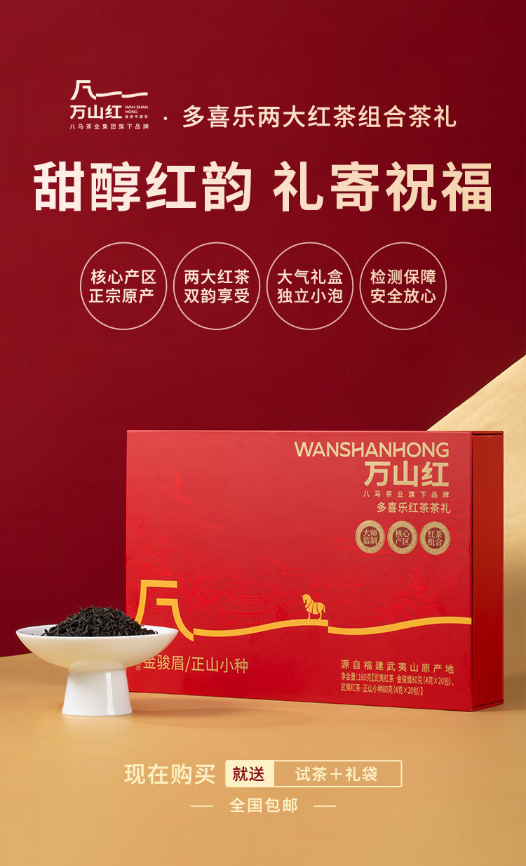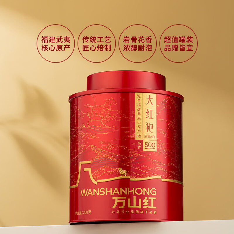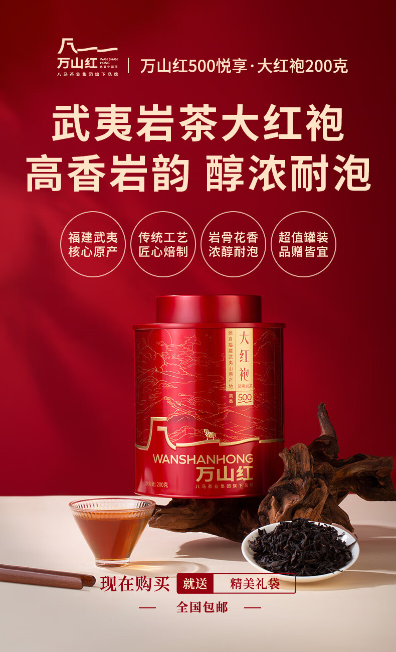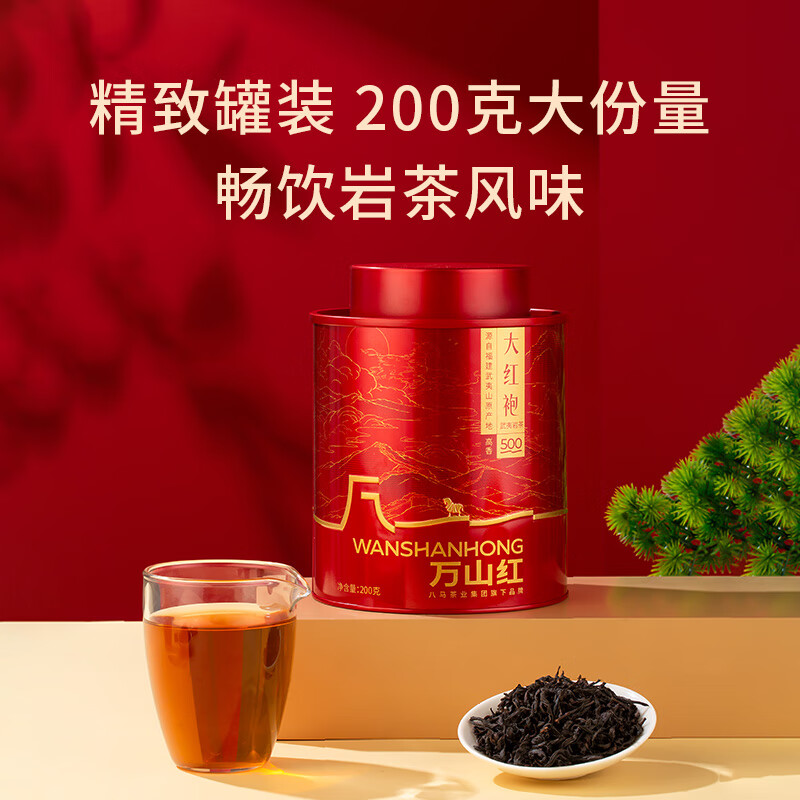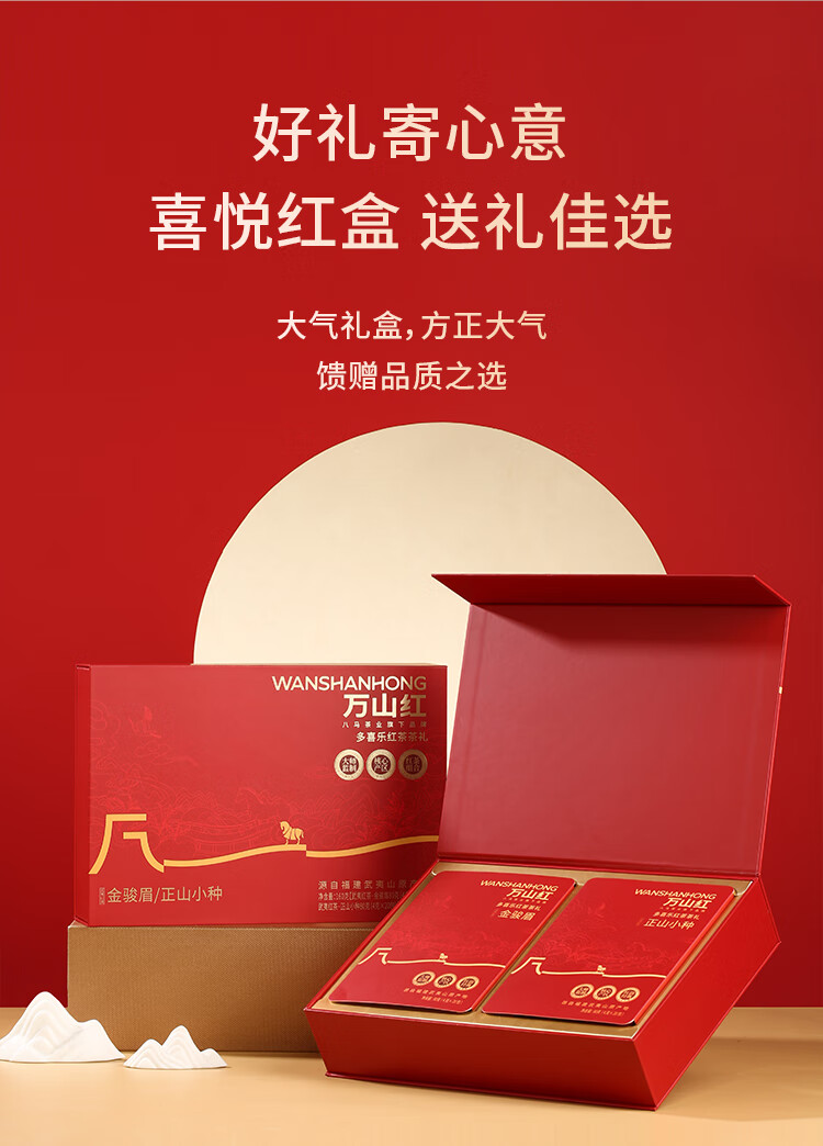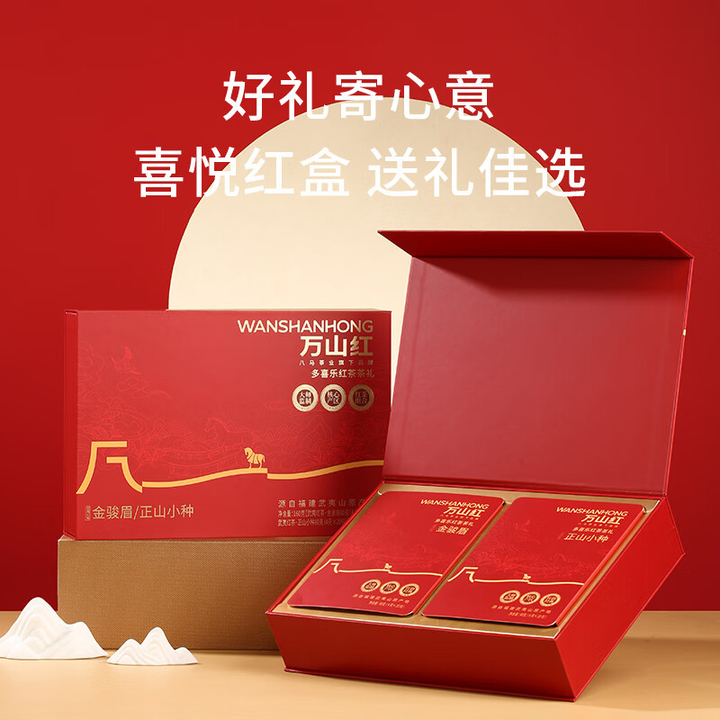 礼盒内配: 武夷岩茶·金骏眉80克(4克*20包) 武夷岩茶·正山小种80克(4克*20包) 净含量:160g 单罐内配:万山红500悦享装大红袍200克 净含量:200g 推荐理由: 自饮一罐,送礼一盒 - 自饮品鉴:对于喜爱武夷茶的消费者,可通过大红袍感受岩茶的醇厚岩韵,通过红茶礼盒体验金骏眉、正山小种的红茶双韵,一次入手能品鉴不同茶类、不同风味,满足多样化饮茶喜好。 - 品质保障:依托八马茶业的专业制茶体系,从产区原料到工艺制作都经过严格把控,产品品质稳定,消费者可放心购买,无需担心品质参差问题。爱武夷茶的消费者,可通过大红袍感受岩茶的醇厚岩韵,通过红茶礼盒体验金骏眉、正山小种的红茶双韵,一次入手能品鉴不同茶类、不同风味,满足多样化饮茶喜好。