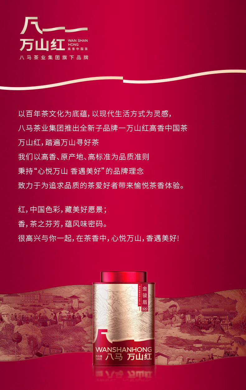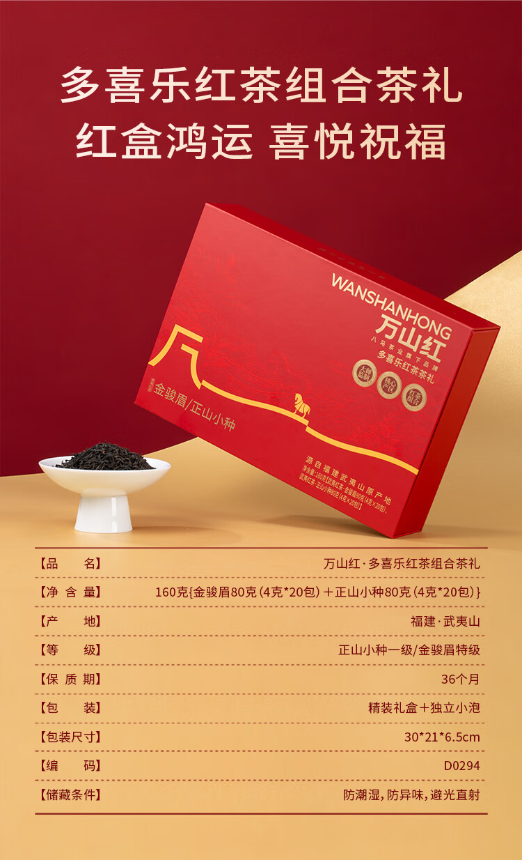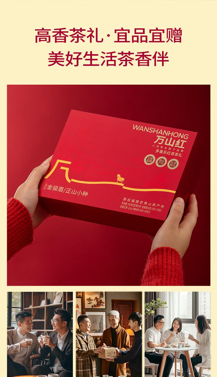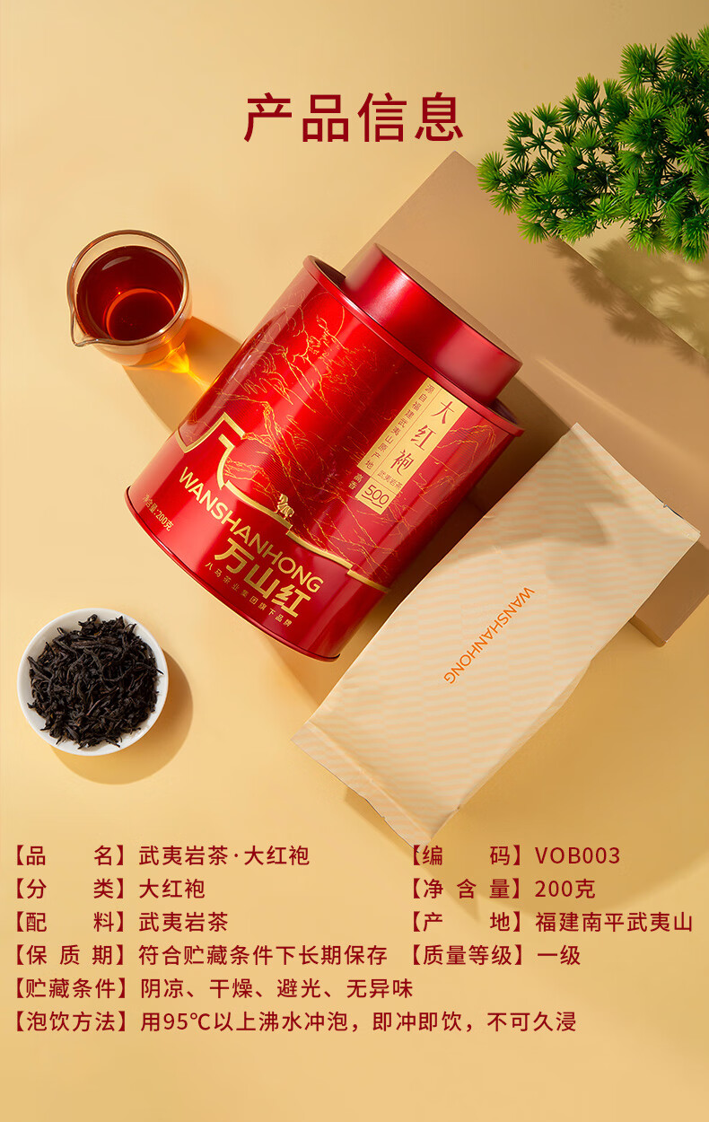礼盒内配: 武夷岩茶·金骏眉80克(4克*20包) 武夷岩茶·正山小种80克(4克*20包) 净含量:160g 单罐内配:万山红500悦享装大红袍200克 净含量:200g 推荐理由: 自饮一罐,送礼一盒 - 自饮品鉴:对于喜爱武夷茶的消费者,可通过大红袍感受岩茶的醇厚岩韵,通过红茶礼盒体验金骏眉、正山小种的红茶双韵,一次入手能品鉴不同茶类、不同风味,满足多样化饮茶喜好。 - 品质保障:依托八马茶业的专业制茶体系,从产区原料到工艺制作都经过严格把控,产品品质稳定,消费者可放心购买,无需担心品质参差问题。爱武夷茶的消费者,可通过大红袍感受岩茶的醇厚岩韵,通过红茶礼盒体验金骏眉、正山小种的红茶双韵,一次入手能品鉴不同茶类、不同风味,满足多样化饮茶喜好。