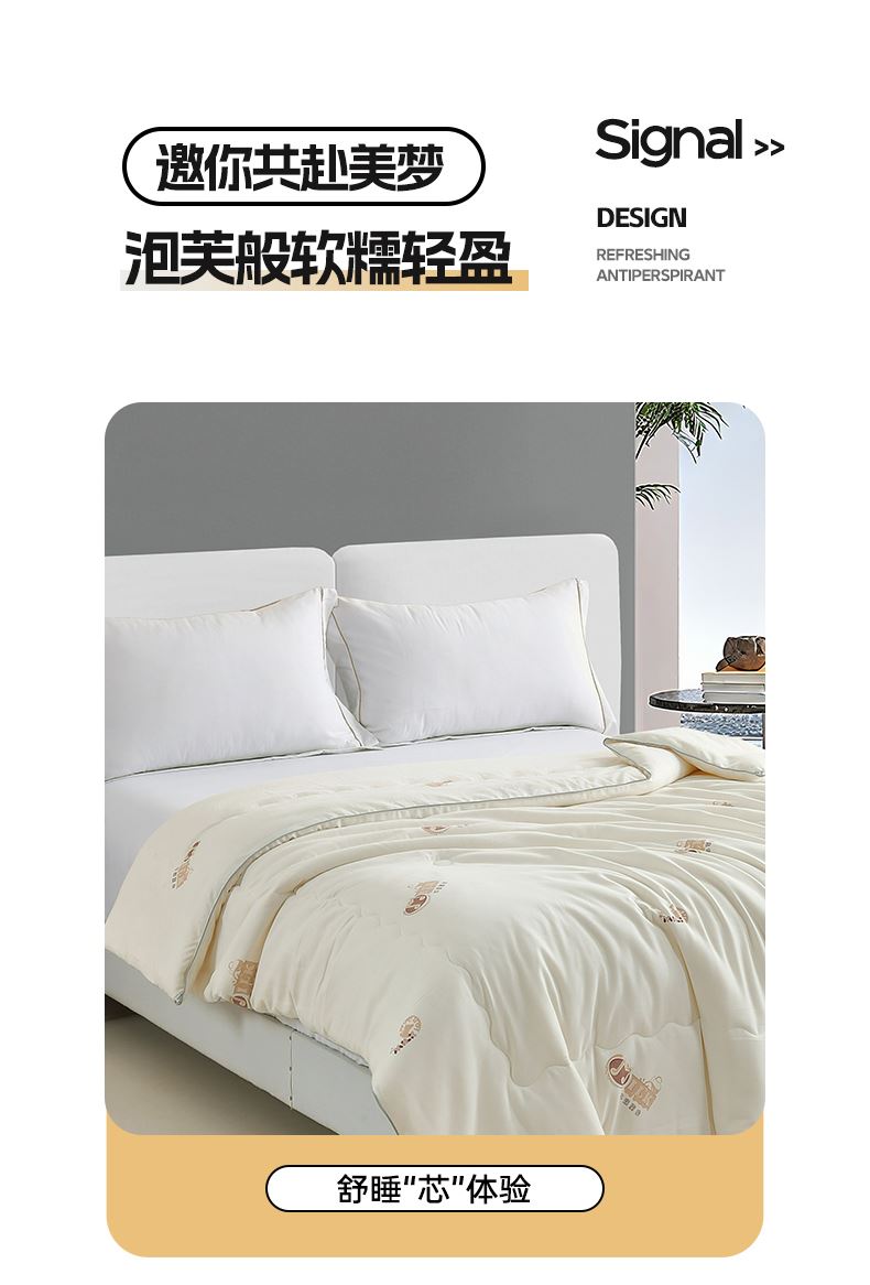 1.被面采用养肤棉,触感似初生乳绒般丝滑细腻。当肌肤与面料接触时,宛若第二层肌肤的温润触感,特别适合敏感肌与追求精致睡眠的人群。
