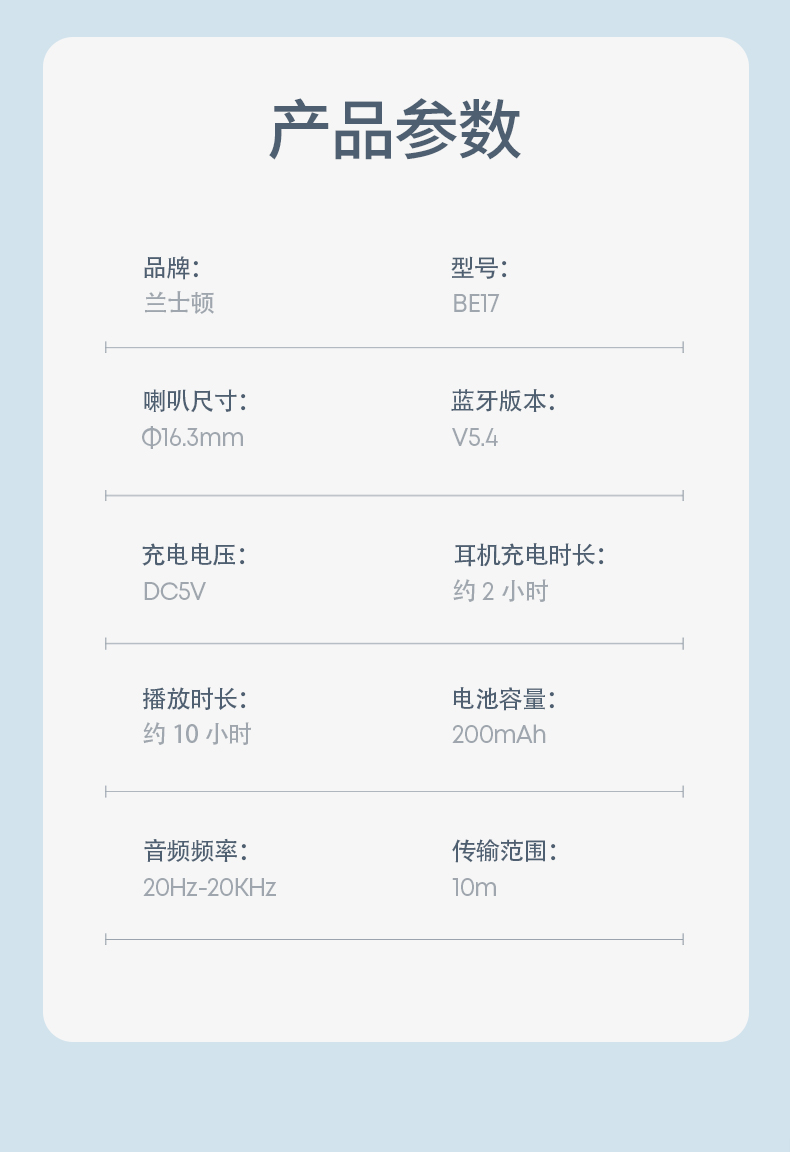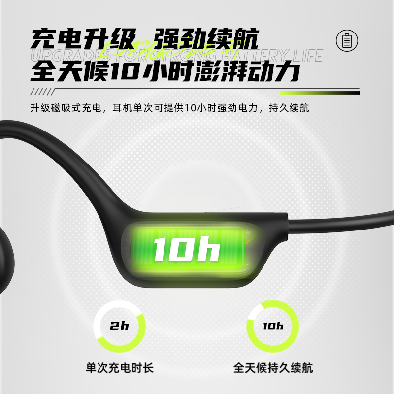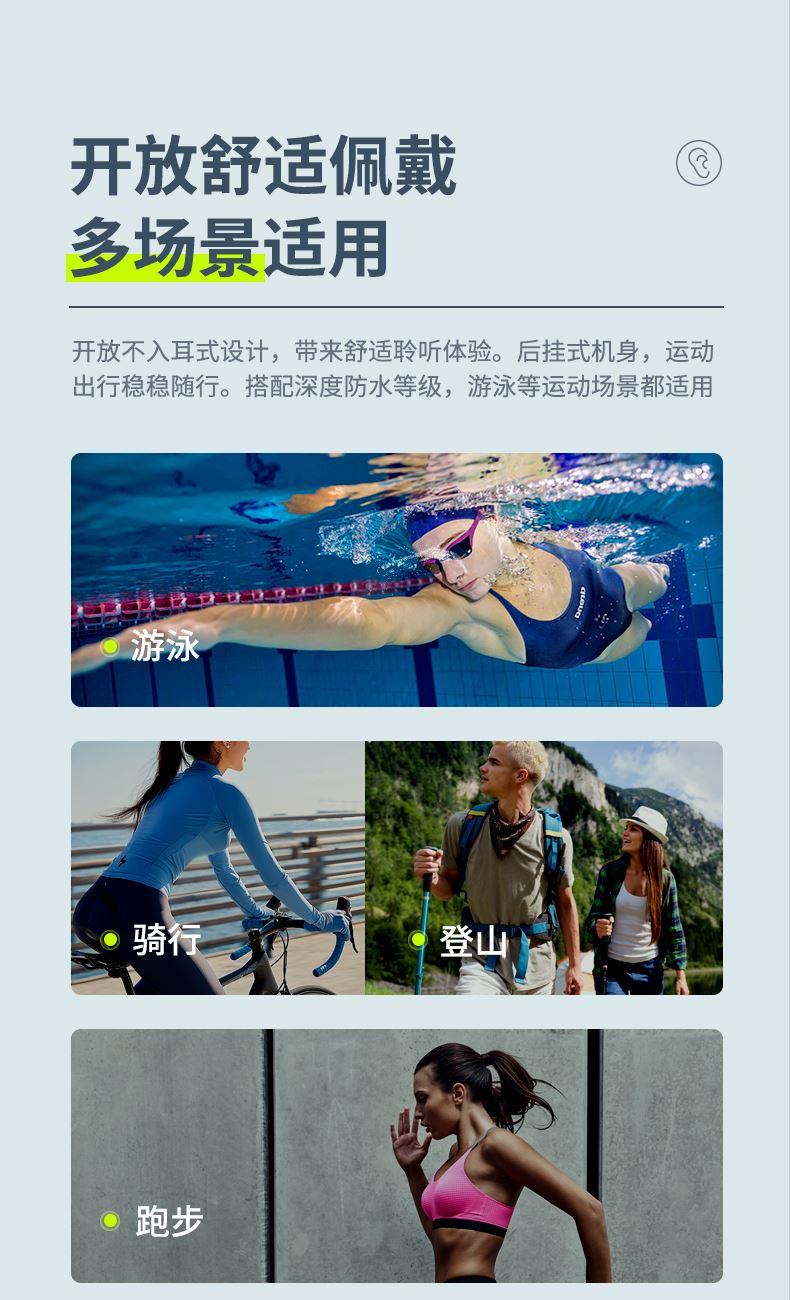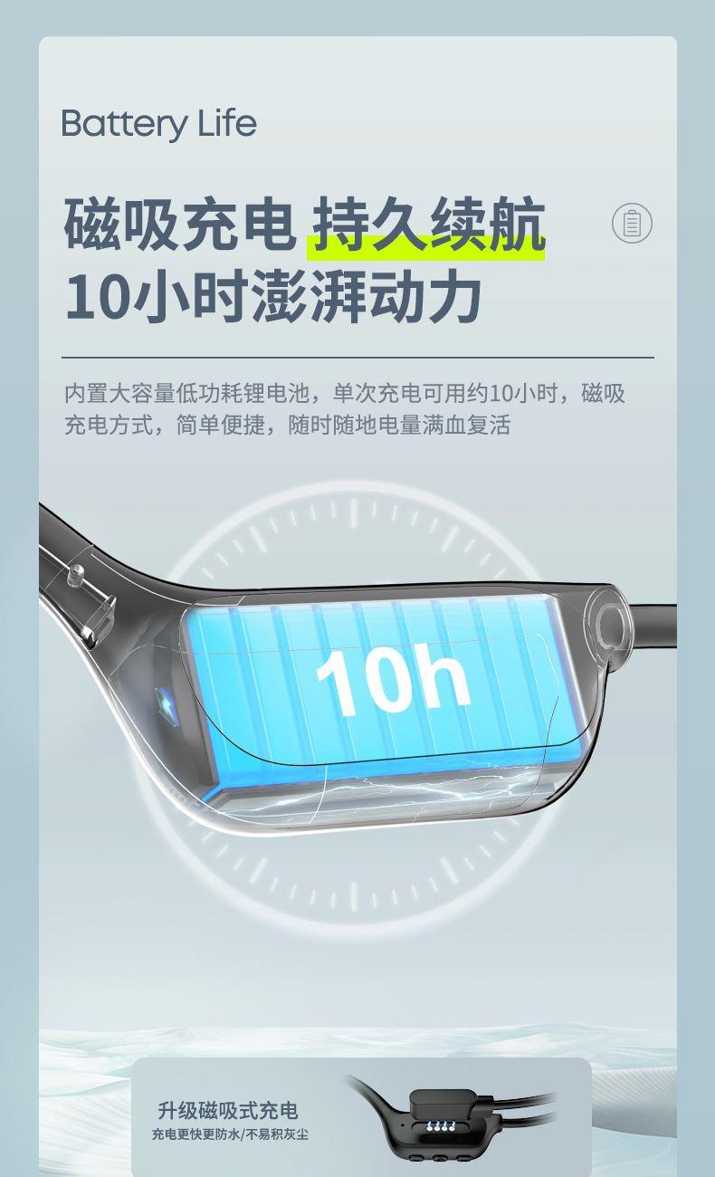 颜色:黑色/白橙色 电池容量:200mAh 包装尺寸:130.5*161.5*53mm 外箱尺寸:580*365*550mm 续航时间:10小时 充电时间:2小时 蓝牙版本:V5.4 防水级别:IPX8 IPX8专业防水,2米水深轻松应对 亚洲人定制后挂,久戴舒适不累 蓝牙+MP3二合一,32G存8000首歌 兰士顿调校,人声清水下音质稳 开放不入耳,健康舒适又稳固 记忆钛合金,360°拉伸1万次不变形 一年免费换新,7天无理由退换
