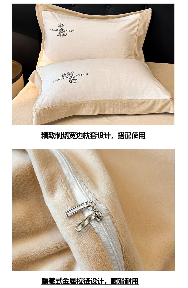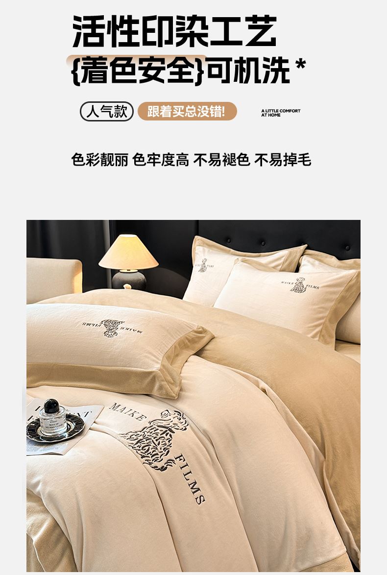 被套:200*230cm 床单:240*245cm 枕套:48*74cm*2 面料:牛奶绒 产品包装:精美软包 包装尺寸:50*40*20cm 特点:牛奶绒面料,充分吸收汗气蒸发产生的热量,舒适透气,精美大方,绒感细腻,呵护您娇嫩肌肤新型植绒技术,绒毛结构丰盈紧实,不易掉毛告别掉毛烦恼。