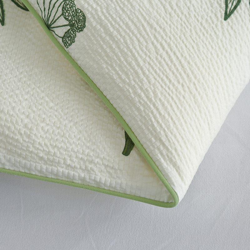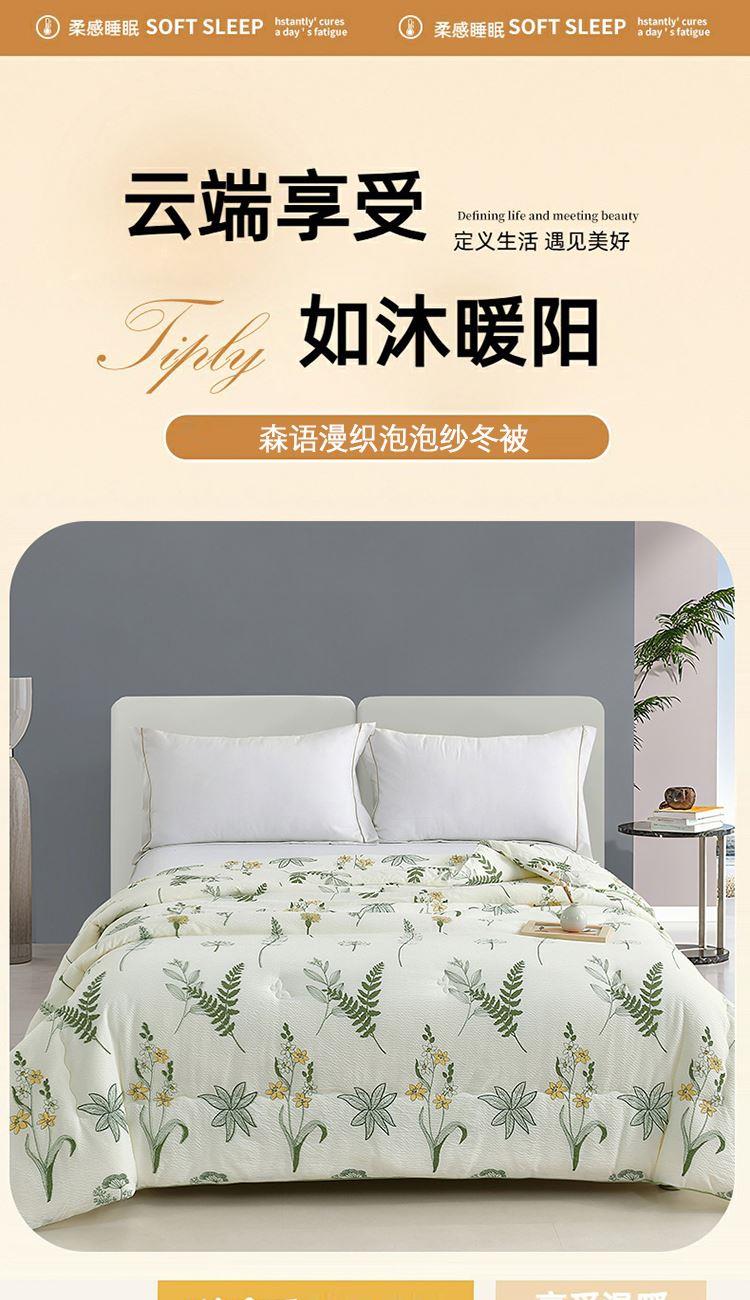 规格:200*230cm 面料:泡泡纱 填充:羽丝棉 重量:2300g 执行标准:GB/T22796-2021 安全类别:GB18401-2010 B类 1.泡泡纱面料通过特殊织造工艺形成立体肌理,减少与皮肤的直接接触,兼顾柔滑质感与透气性能。 2.羽丝棉填充均匀饱满,不易结块变形,长久保持蓬松柔软。整被可机洗易打理,持久耐用,适合秋冬季节使用,带来干爽温暖、呼吸自在的舒适睡眠体验。
