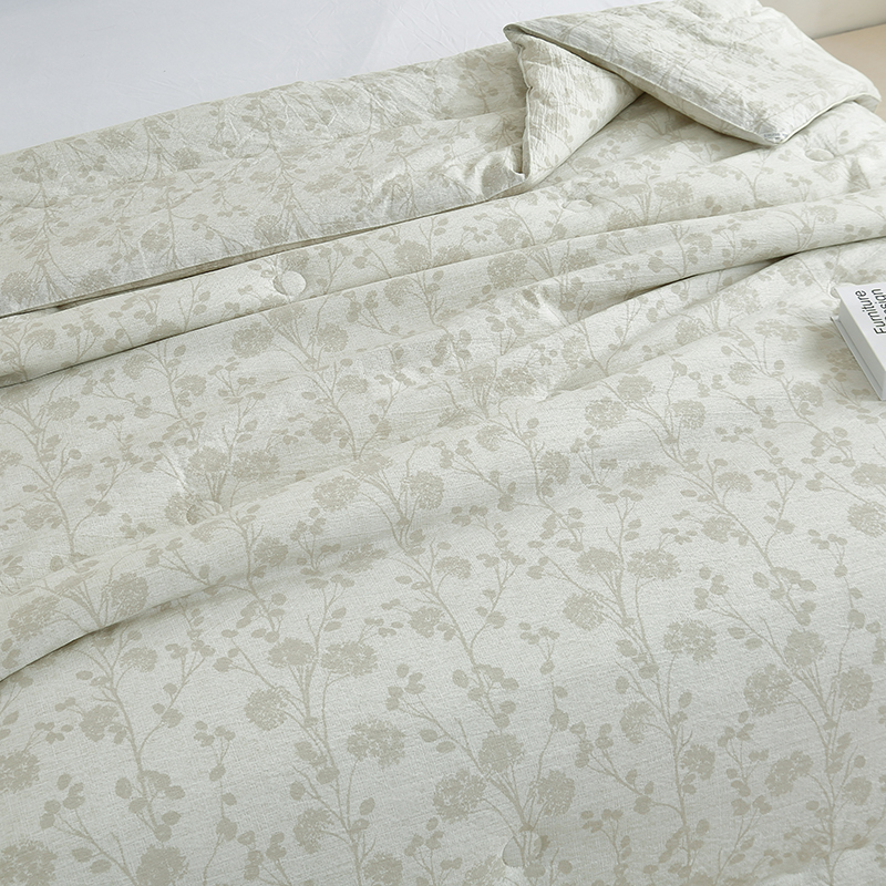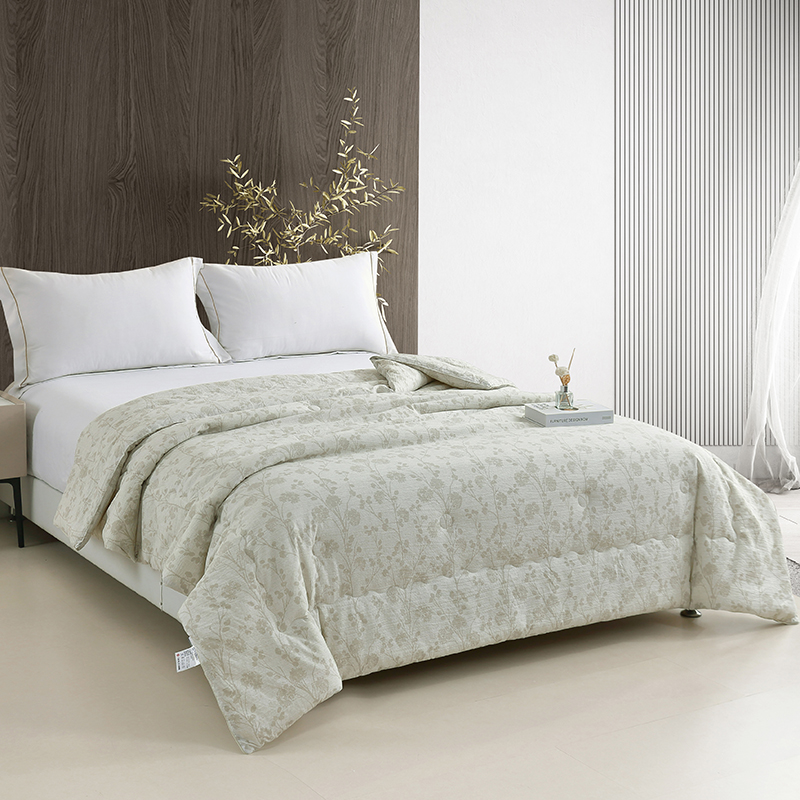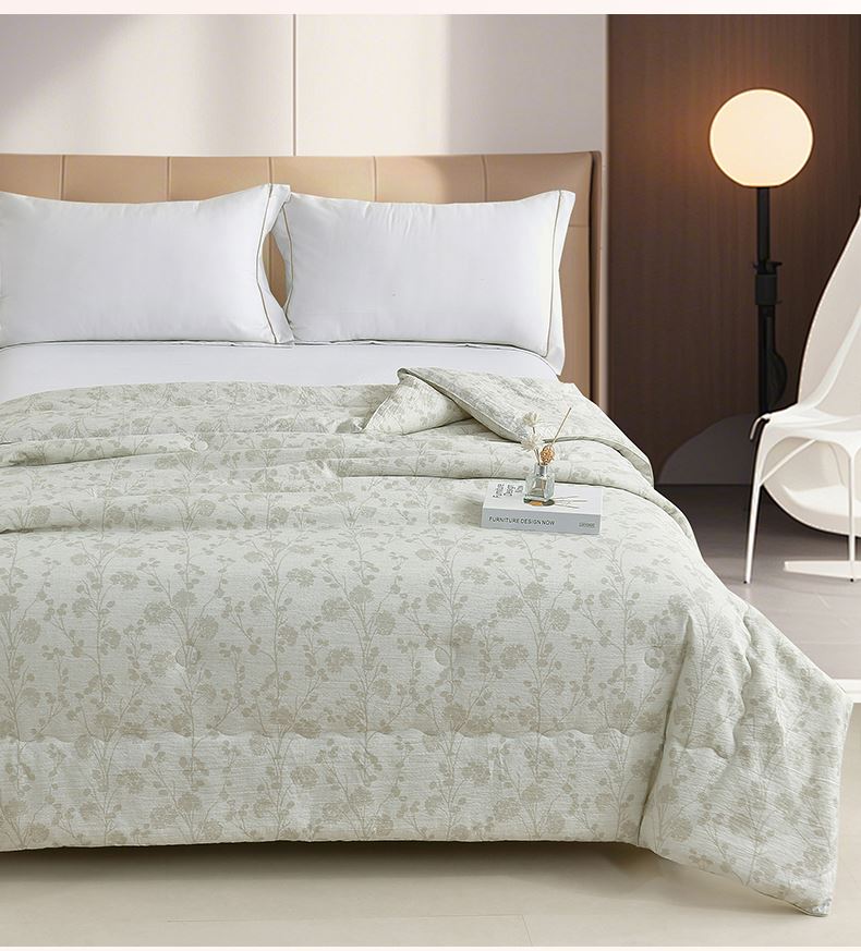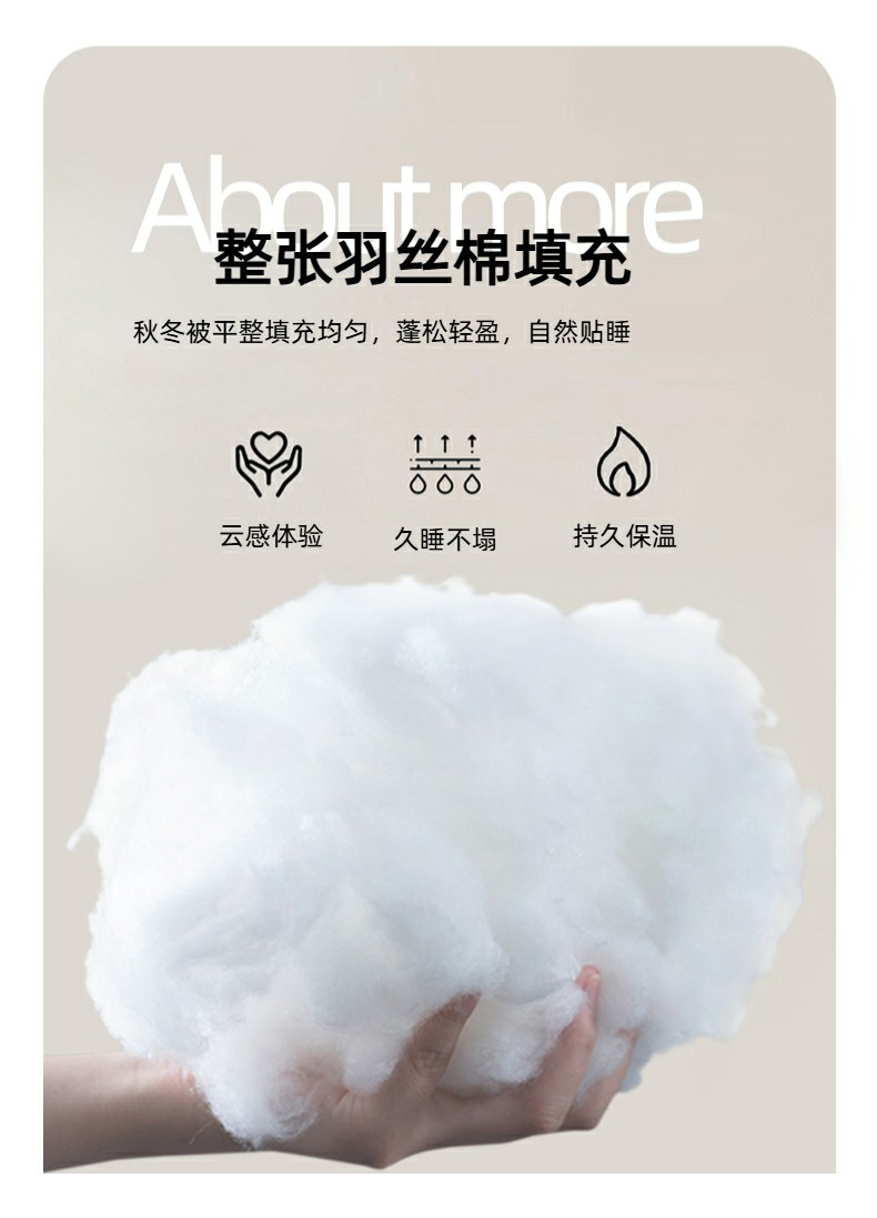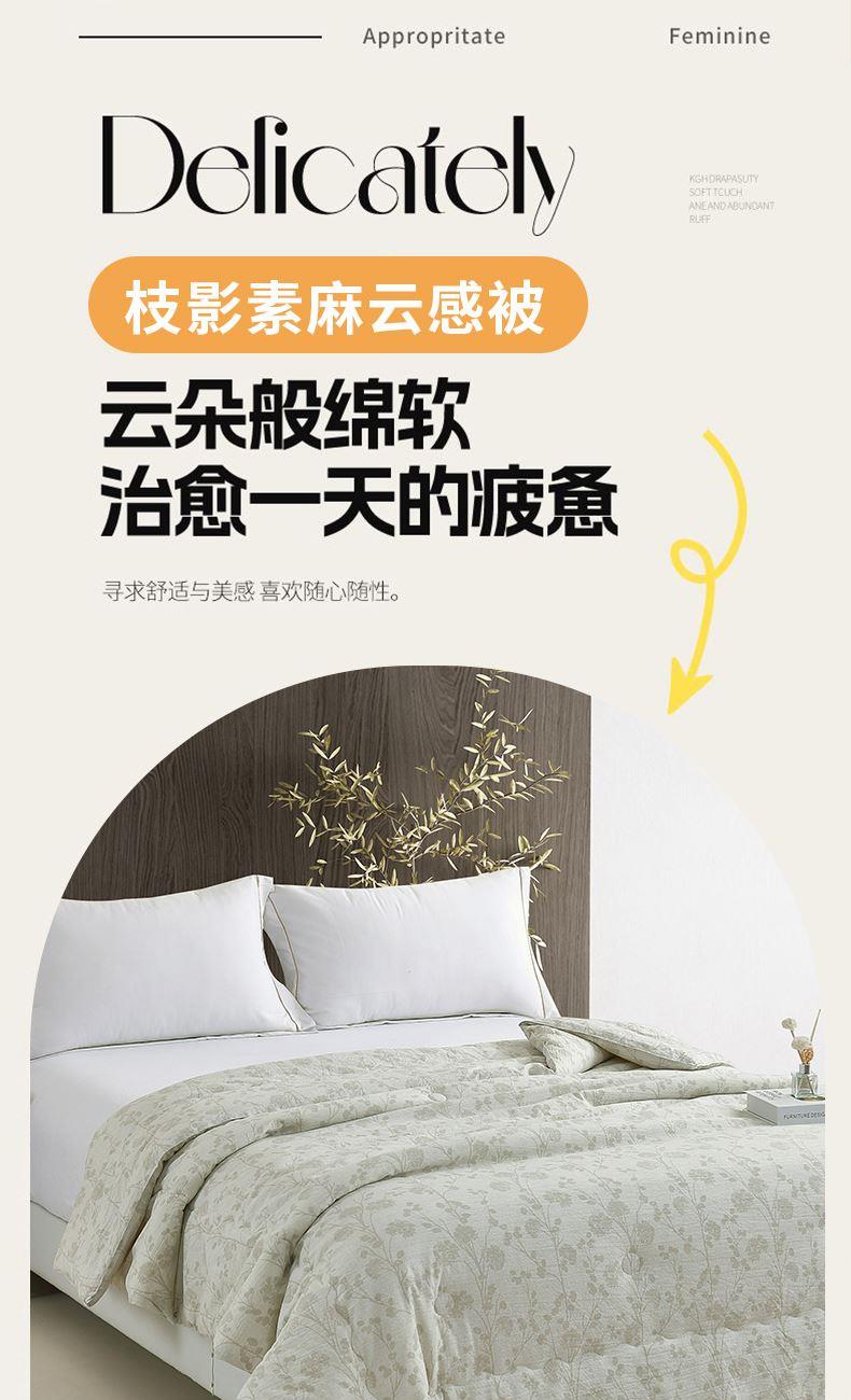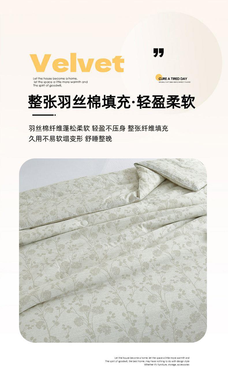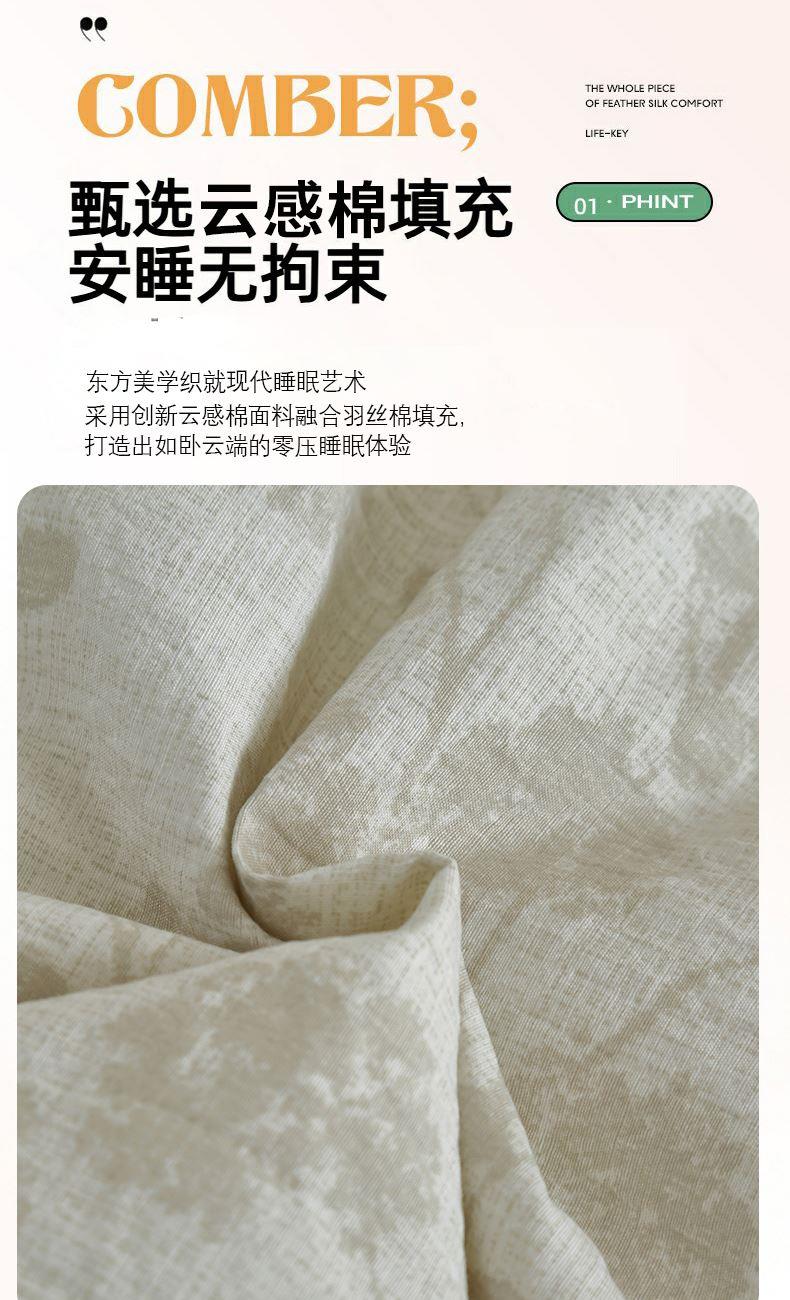 规格:200*230cm 面料:云感棉 填充:羽丝棉 重量:2600g 执行标准:GB/T22796-2021 安全类别:GB18401-2010 B类 以东方美学织就现代睡眠艺术,采用创新云感棉面料融合羽丝棉填充,打造出如卧云端的零压睡眠体验。云感棉采用百叶织法与传统麻纹肌理交织,表面呈现素雅枝影纹路,触感却异常柔软亲肤真正做到肤感清凉爽滑却不失温暖守护。