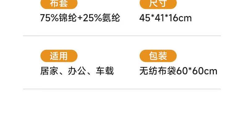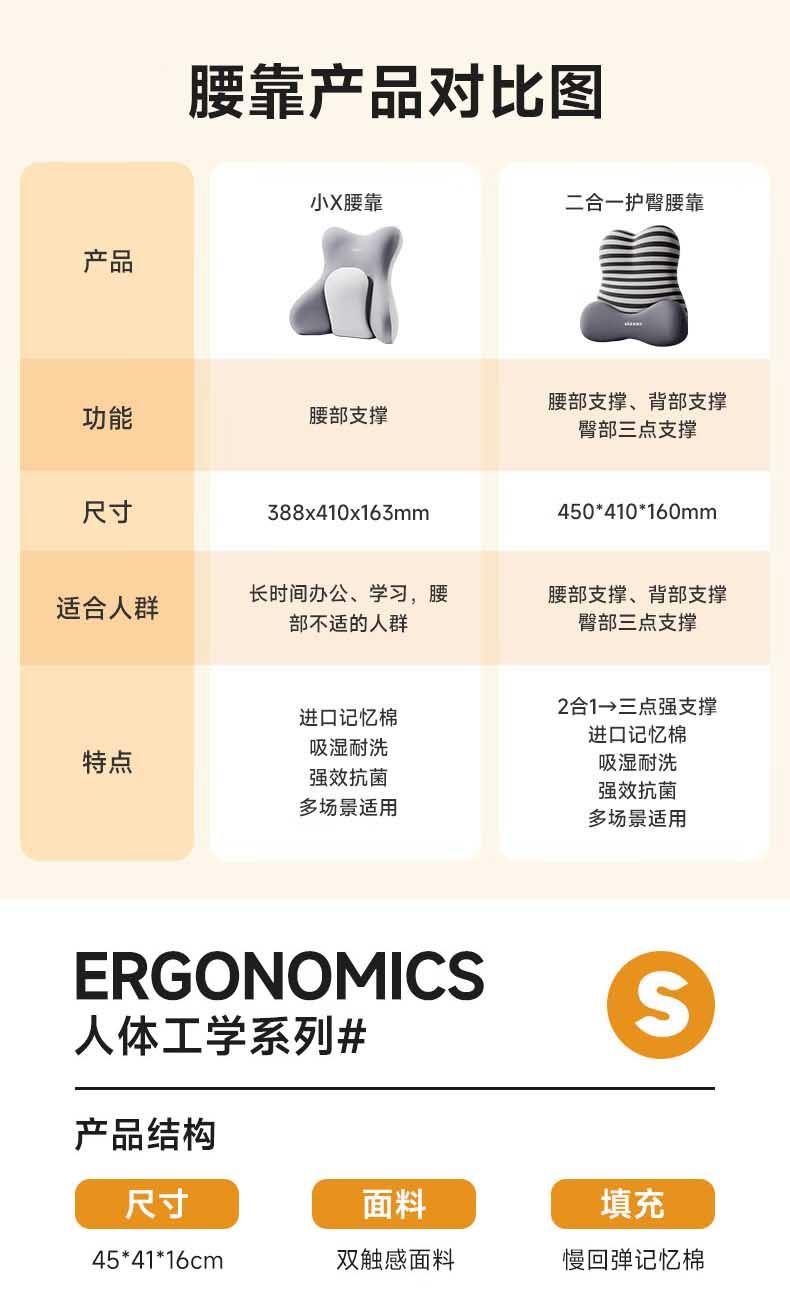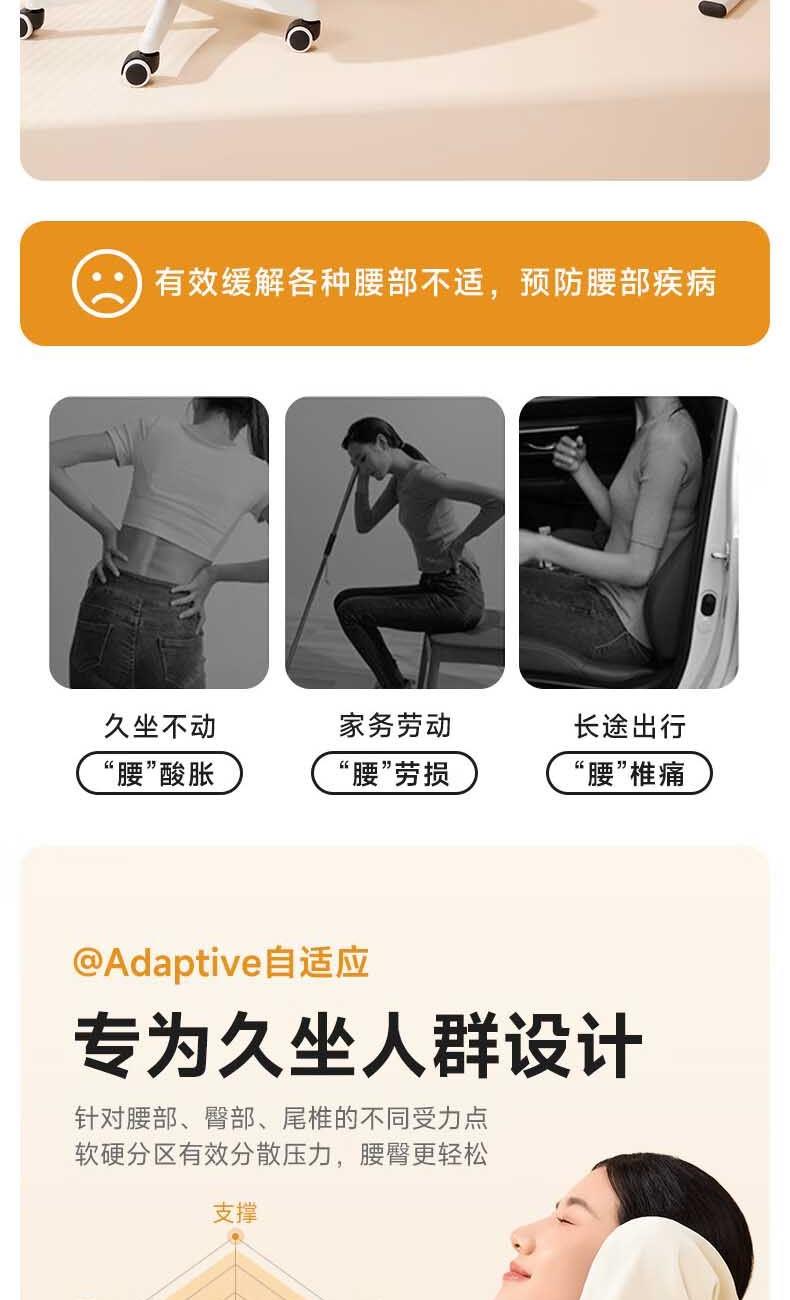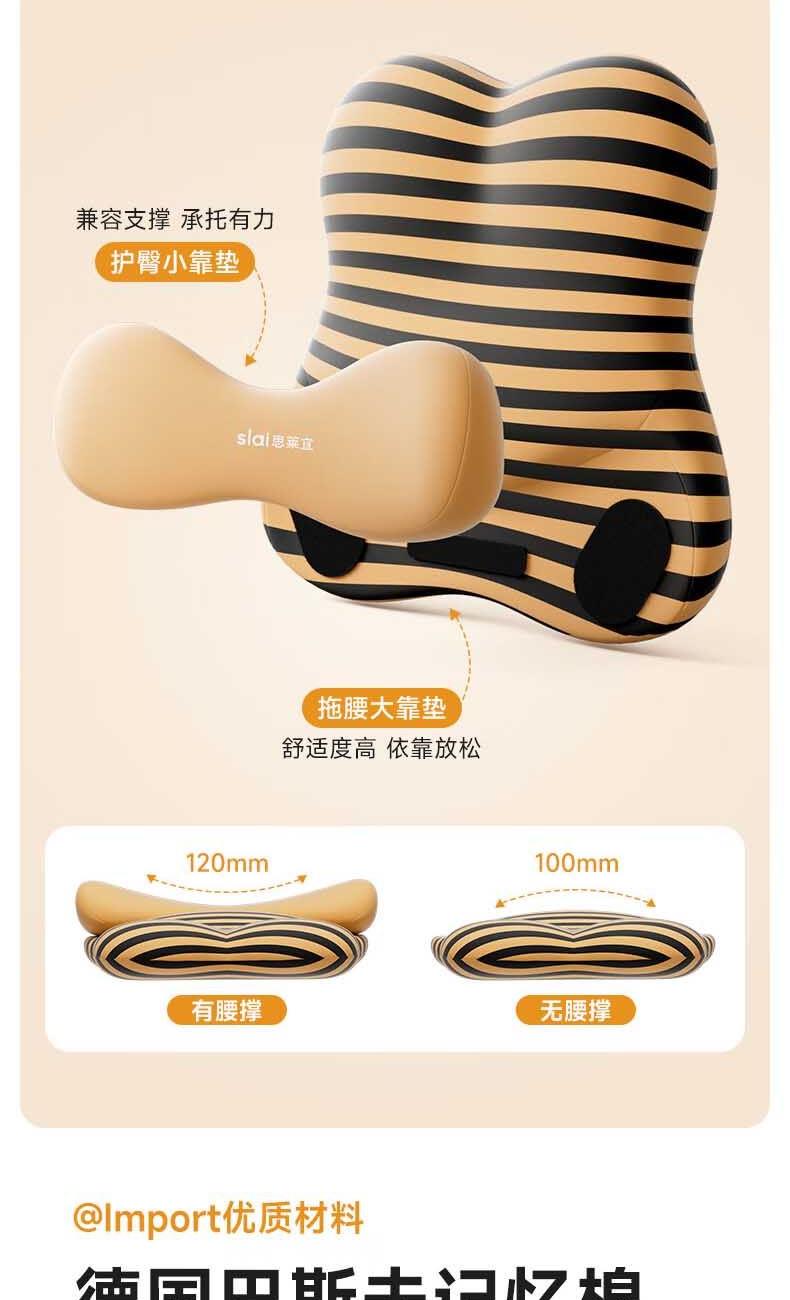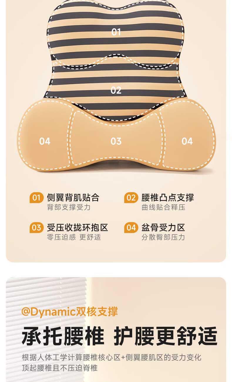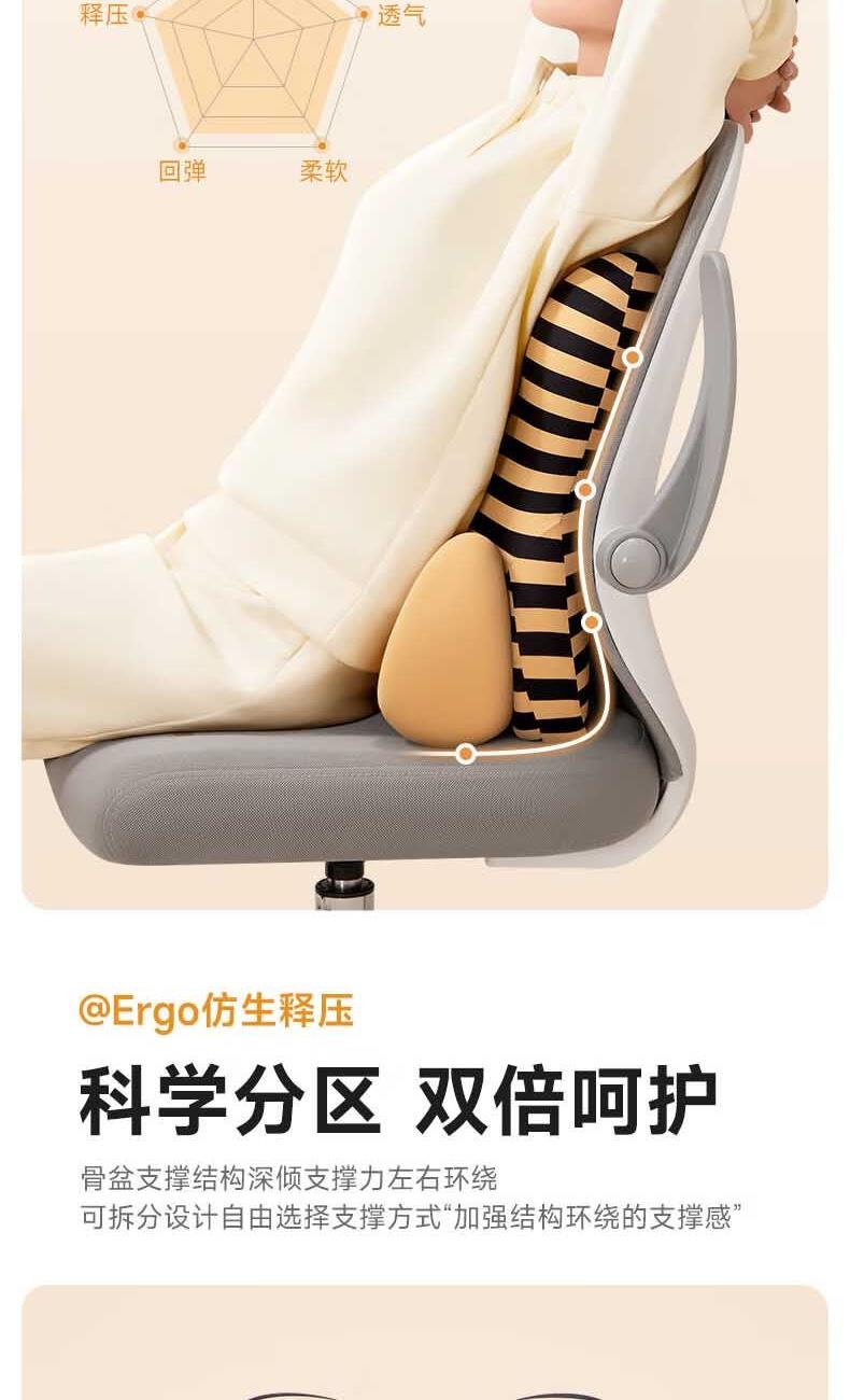 【人体工学】全背贴合,支撑腰部、臀部、尾椎的不同受力点; 【软硬分区】硬垫支撑强,软垫靠着更舒适,双核支撑腰臀同护。 【德国巴斯夫记忆棉】5秒慢回弹,缓冲压感; 【亲肤舒适面料】 吸湿透气,久靠不闷热。